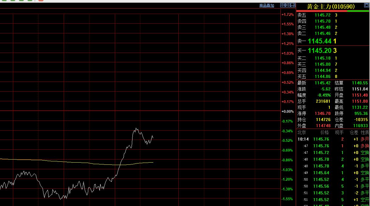套路永远是一样的, 只是会变幻一样。 随着外盘金价的反弹, 日内恢复交易后, 国内黄金期货再度直线拉升, 但是依旧处于跌势中, 没能让盘面翻红。 截止10:15分, 国内黄金主力合约 停收于1145.42元, 较上一日下跌5.62元。 对于黄金期货后市, 期货小褚观点不变, 依旧处于回调中!
