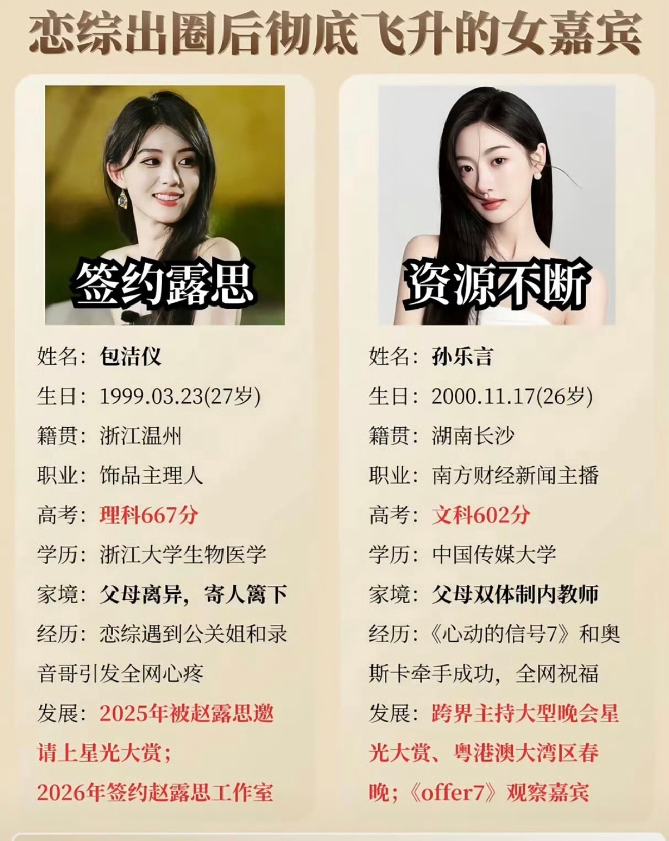 两位恋综女嘉宾参加完恋综后的后续对比包洁仪和孙乐言