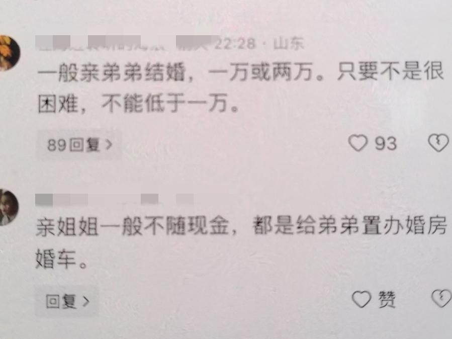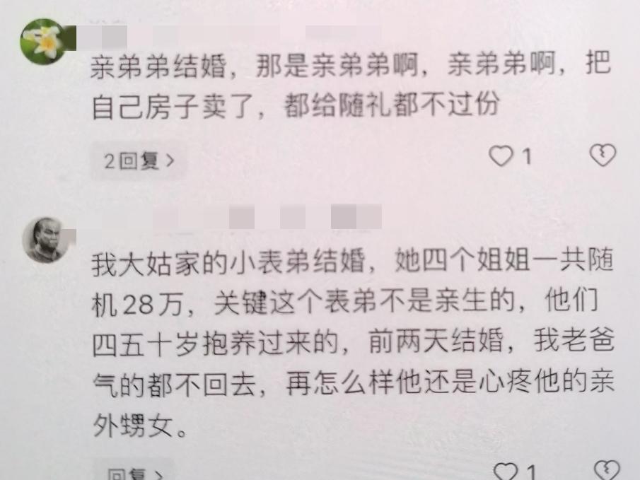 亲弟弟结婚姐姐应该随多少礼钱? 一女士闷闷不乐的向网友们倾诉, 自己弟弟结婚,自己经济条件一般准备随5000,结果妈妈不愿意了说至少10000…… 评论区的有些言论好炸锅, 有人说一般亲弟弟结婚,一万或两万,只要不是很困难,不能低于一万; 有人说亲姐姐一般不随现金,都是给弟弟置办婚房婚车; 有人说亲弟弟结婚,那是亲弟弟啊,把自己房子卖了,都给随礼都不过分; …… 真的,我们好多规矩都是冲着女儿来的, 其实说白了就是压榨女儿,把女儿当外人,能占一分是一分,所有的重礼金承受对象都是女性,姐姐对弟弟,姑姑对侄子,女儿对父母……所以逼的女儿长大了不认家…… 只是重男轻女是千年陋习,想改变几乎是不可能的,其实做父母的可以偏爱,但别用压榨一方来偏爱另一方……