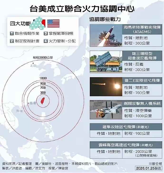 - 2026年1月,台当局在台北大直博爱营区设立所谓“联合火力协调中心”,美方军、文职人员进驻,开展联合情报、火力规划作业,台防务部门公开承认美方人员在场。 - 核心功能:统筹台军不对称火力(海马斯、鱼叉等美制装备),对接美军卫星、侦察机情报,介入目标选定与作战计划,被舆论直指为美方“监军”、实质插手台军指挥。 - 运作模式:以“制度化军事交流”为幌子,行军事勾连、以武拒统之实,妄图依托美方情报与指挥链提升所谓“防卫能力”。
