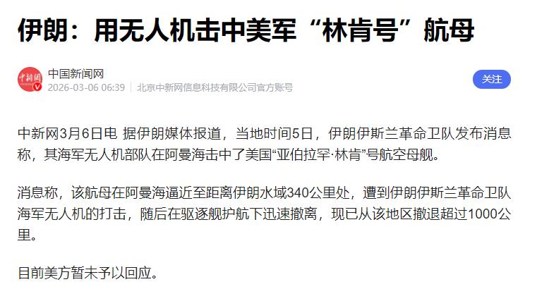 伊朗真敢打!无人机击中美军林肯号,美军连夜撤了1000多公里 据伊朗媒体说,当地时间3月5号,伊朗伊斯兰革命卫队说,他们海军的无人机,在阿曼海打中了美国的“林肯号”航母。 当时这艘航母,已经开到离伊朗水域只有340公里的地方,离得很近,对伊朗来说,这就是明摆着的挑衅。 被无人机打中后,美军没敢多待,赶紧让驱逐舰护着往回跑。到3月6号消息发出来的时候,这艘航母已经从出事的地方撤了1000多公里,看得出来,美军是真怕了,不想再跟伊朗正面冲突。 有人可能会问,伊朗咋敢打美国航母?要知道,美国一直是军事强国,航母更是他们的核心力量,平时都是美国欺负别人,哪轮得到伊朗动手? 其实这不是伊朗一时冲动,背后是美伊多年的矛盾,再加上近期局势越来越紧张。 这些年,美国一直跟伊朗过不去,制裁伊朗经济,还在伊朗周边放了很多军队,经常派军舰、战机在附近晃悠,挑衅伊朗。 就在这次打航母之前,2月底开始,美国和以色列一起打伊朗,几天就打中伊朗近2000个目标,沉了17艘伊朗船,还死了1200多人。 更直接的是,3月4号,美军在印度洋沉了伊朗一艘护卫舰,船上130个船员,死了100多个,伊朗当时就警告美国,要报复,这次打航母,就是伊朗的反击,不是没原因的。 再说说,伊朗的无人机为啥能打中航母?很多人觉得,航母那么大,还有驱逐舰保护,咋会被无人机打中? 其实伊朗的无人机并不弱,这些年一直在发展,尤其是那种自杀式无人机,花钱少、飞得远,还能精准打目标。 而且伊朗在海岸线上放了很多导弹和无人机,美军航母离伊朗340公里,刚好在无人机的打击范围内,所以能打中。 还有,美军为啥撤那么远?不是打不过,是不敢恋战。伊朗反击力度比美军预想的大,自从美以打伊朗,伊朗已经反击了21轮,发射了几百枚导弹和几千架无人机,大部分都打在美国设施上。 美军知道,再待下去,损失会更大,航母要是被打坏了,损失就太严重了,所以赶紧撤退。 大家可能还关心,这事之后,美伊会不会打起来?目前来看,双方还在对抗,但都没打算彻底撕破脸。 美国说暂时不派地面部队,伊朗也没主动扩大冲突。另外,这事还牵扯到霍尔木兹海峡,这里是全球重要的石油通道,伊朗说不让美国、以色列的船过,要是封了,油价可能会涨。 目前美伊冲突还在持续,咱们接着关注就行,这事也能看出来,不管国家大小,只要自己有实力,就不会被人欺负,咱们普通人也能明白,和平确实来之不易。