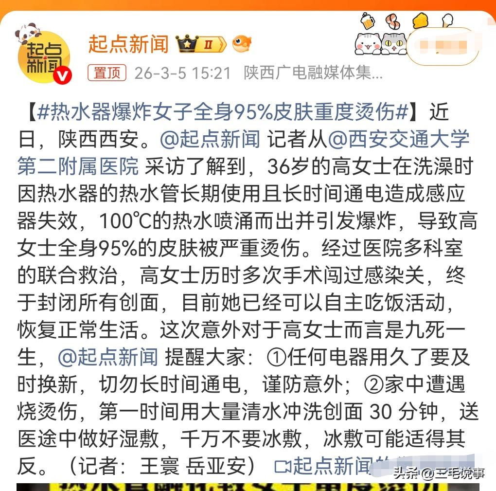 这真的是太可怕了,防不胜防啊。 近日报道,陕西西安。热水器爆炸女子全身95%皮肤重度烫伤。 热水管长期使用导致感应器失效,100度的热水喷涌,竟然造成95%的皮肤重度烫伤,经过了6次手术得以恢复。 期间下了好几次病危通知书。 能够活下来,也算是不幸中的万幸了。 用久了的电器要及时换,烫伤不要冰敷,以免适得其反,湿敷就行了,烫伤后,第一时间用清水冲洗创面。