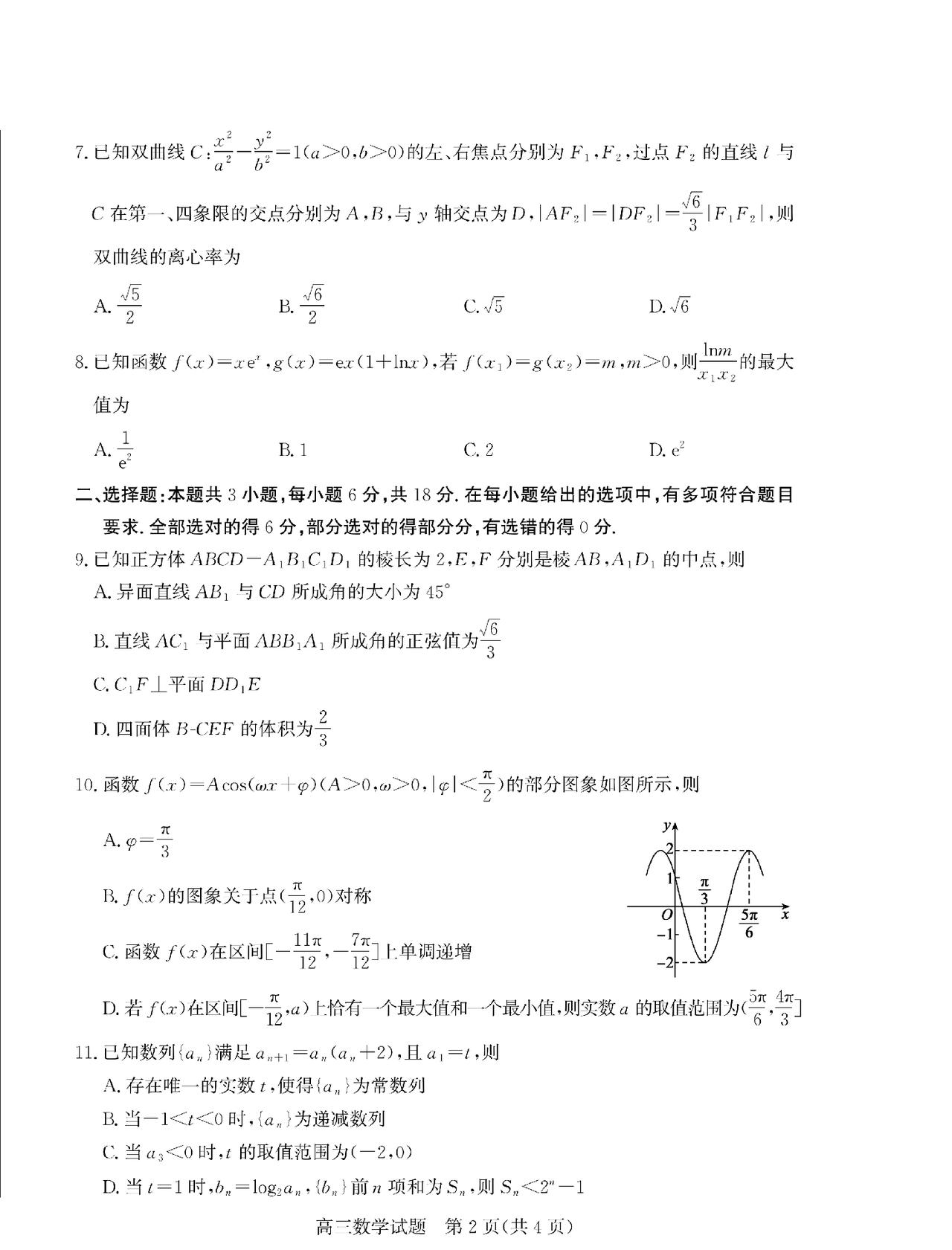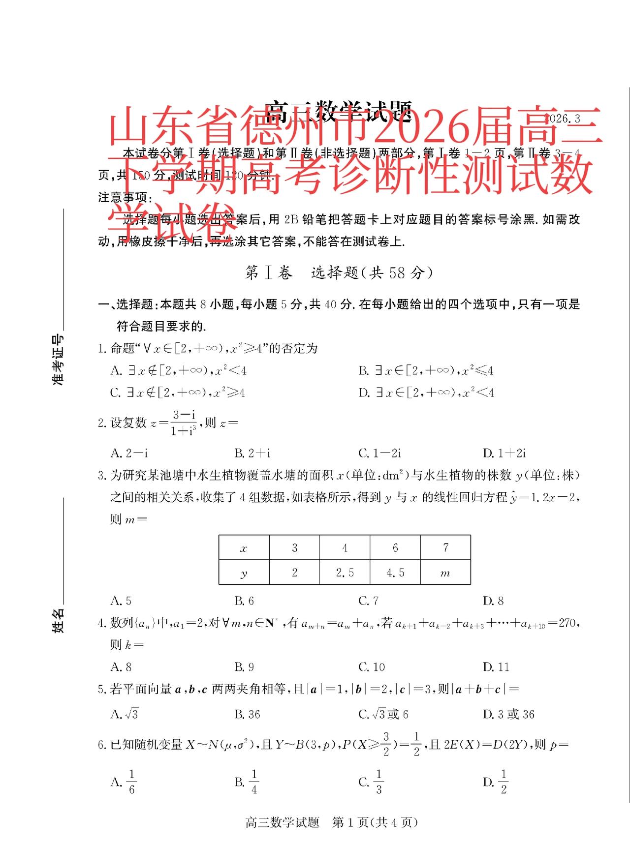 山东省烟台、德州市2026届高三下学期高考诊断性测试数学试卷单选题、多选题、填空题及其答案。