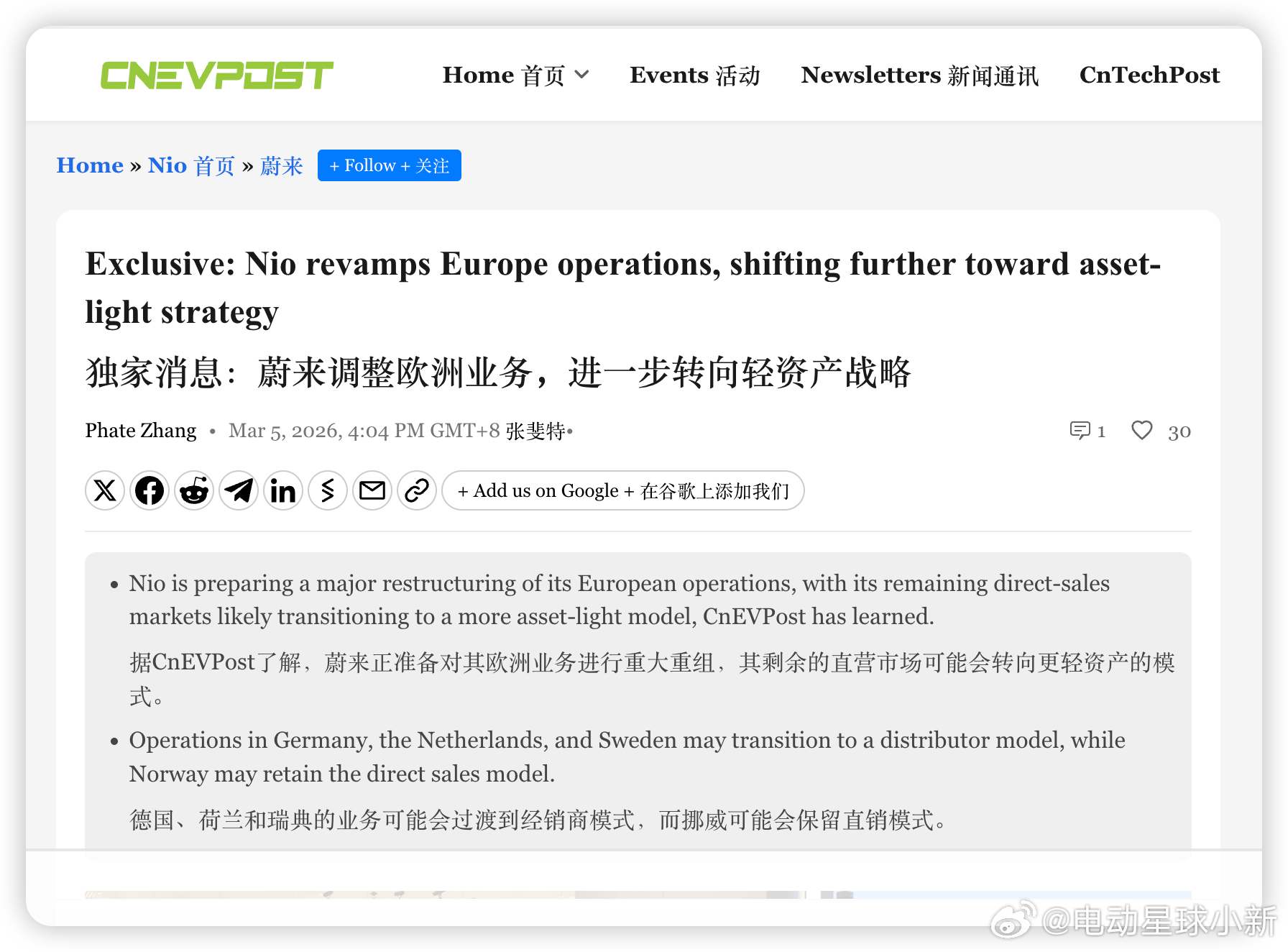 德国、荷兰、瑞典或从直营转为经销商模式,挪威因电动车渗透率高保留直营,蔚来挪威公司也在新架构中保留。
