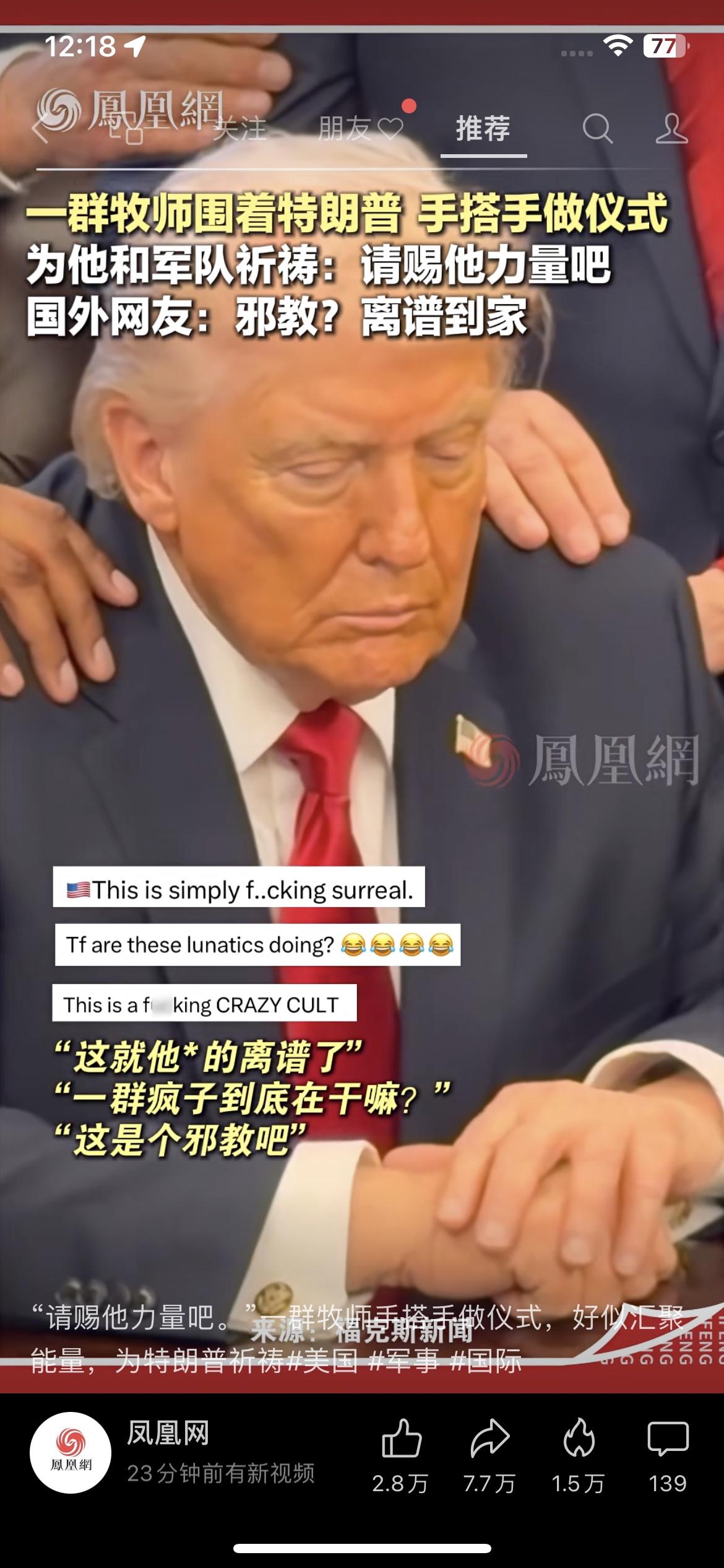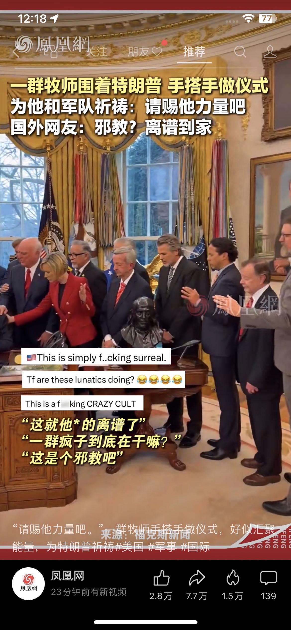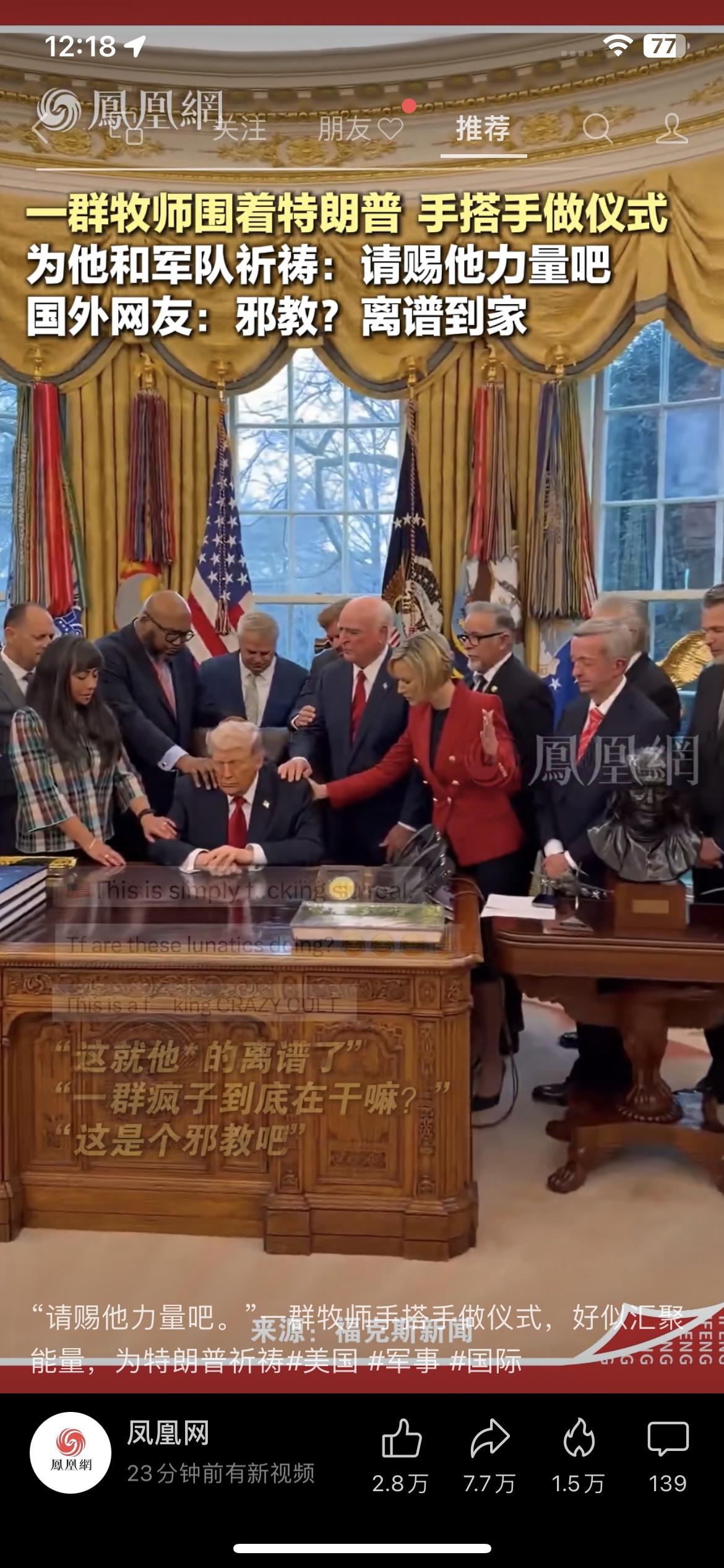 白宫变“祭坛”?特朗普被一群牧师围在中间,手搭手“传功”,网友炸了:邪教现场? 这一幕,真的太魔幻了! 就在白宫的椭圆办公室里,特朗普正低着头,双手交叠放在桌上。一群牧师和官员围在他身边,把手搭在彼此和他的肩膀上,嘴里念念有词,像是在进行某种神秘仪式,为他和美国军队“祈福”,祈求“赐给他力量”。 视频一出,外网直接炸锅: • “这简直超现实到离谱!” • “这群疯子到底在干嘛?” • “这就是个疯狂的邪教吧!” 在美国,宗教和政治的边界一直很微妙,但像这样把总统当成“神坛上的祭品”,还是头一回见。不少人担心,这种把个人崇拜和宗教狂热绑定的操作,正在撕裂美国社会。 你怎么看?这是信仰的力量,还是权力的疯狂?