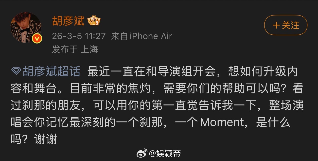巡演惊喜不断!胡彦斌「是一场烟火・刹那」巡回演唱会,苏州站今日开启购票通道,天津站将于5月23日盛大开唱。同时胡彦斌超话求助粉丝快去分享你印象深刻的演唱会moment吧。