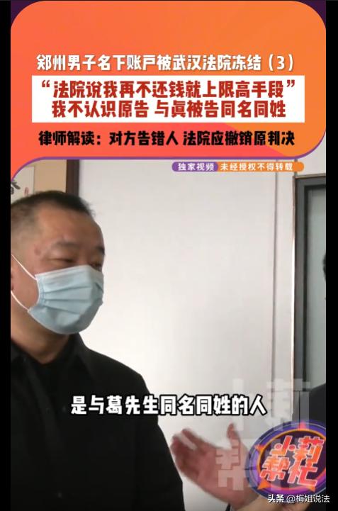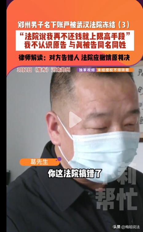 河南郑州,葛先生正刷着手机,突然弹出一条 账户被冻结” 的提示,他当时第一反应以为是诈骗没理会,没往心里去。可到了晚上,葛先生想买点东西, 准备付款的时候,却发现页面直接显示无法支付,提示账户被冻结,自己名下的支付账户和所有银行卡,全部冻结。 这下葛先生慌了才反应过来。之前的提示不是假的,是真被冻结了!第二天一大早,着急忙慌地联系上了武汉市东西湖区人民法院。 法院称他不仅欠1万,更是累计欠了尹某某4笔钱,这才被对方起诉。还被警告 “不还款就限高”! 这一通电话打下来,葛先生懵了,他根本不认识什么尹女士,这几年没有去过武汉,连这个人面都没见过,怎么可能欠她钱?! 为了弄清楚真相,葛先生向法院索要判决书。拿到判决书一看,上面的身份证号、家庭住址与他的信息一字不差。 白纸黑字写着 :原被告相识多年,2018年4月被告通过支付宝向原告借款7万元,剩余欠款未还,原告多次催要无果,这才向法院提起诉讼。 葛先生百口莫辩,他反复向法院说明自己与尹某某素不相识,提出与原告当面对质,把事情说清楚,却被直接驳回。 法院工作人员反过来质问他:原告微信里一直喊你师兄,你怎么可能不认识她? 葛先生气得声音发抖:我手机里根本没有这个好友,连她是谁都不知道! 那边冷冰冰的回应:信息全对得上,再不还钱,你就等着限高吧。 生活也因为这件事乱了套,账户被冻结,他出门买东西只能用现金,说给别人听都不信还笑话他。因为资金往来停滞,生意也受到严重影响。 葛先生满心委屈:平白无故背锅,跟谁解释都没人信,我就是个冤大头! 无奈之下他现在只能求助媒体,记者介入后,第一时间陪同葛先生展开调查,真相这才慢慢浮出水面 。 葛先生向记者透露,原告律师后来曾向他提供过真正被告的支付信息,名字和他一模一样,他这才明白,自己只是和真正的欠款人同名同姓。 律师称,葛先生的个人信息,是从派出所调取过来的。 这一点让葛先生心里充满了疑问:原告尹女士明明可以看到他的照片,只要一对照,就应该知道这个人根本不是她认识的那个 “师兄”,也不是借钱的那个人,可为什么在明知道认错人的情况下,还是执意起诉了他? 没有人给他回答,而离谱的事情还在继续。 2月14日,葛先生的账户突然被解冻、没有解释原因,就像当初突然被冻结一样。 本以为账户解冻,这场无妄之灾就该结束了。 从解冻到3月2日,整整半个月,那起错误的执行案件信息,还一直挂在人民法院网上。 葛先生对记者说:怕错误记录影响自己的征信,更担心牵连孩子上学、就业。他唯一的希望,就是法院能尽快把这个错误信息彻底删除,还自己一个清白。 记者得知他的担忧后,协助葛先生再次联系法院。可法院表示账户解冻是原告主动撤回的,具体缘由需要跟原告方联系。 没有办法,只能再次主动联系原告的代理律师。 在3月2日记者跟进的采访沟通中,这位律师终于不再回避,直面问题并亲口承认:确实告错人了,是我们的工作失误,您在2月13号联系了我,我14日就立刻撤回了执行申请书。 面对律师的解释,葛先生按捺不住心中的火:你们一句告错了、撤了执行,就完事了? 我不信!同名同姓的人那么多,你们连人都不认真核对、不跟原告确认清楚,就敢随便冻结我全部账户? 记者在通话中直面原告律师,发出质问,句句直击要害:你作为代理律师,起诉前核实被告真实身份是最基本的职责吧? 就因为同名同姓,连照片、实际的借贷往来、身份信息都不仔细核对,就直接起诉,还申请冻结了葛先生的全部账户,这是不是你们的工作疏漏? 律师低声辩解:主要是原告和真正的欠款人隔了好几年没见,对信息记不太清,只提供了名字和大致地址,派出所调的信息又对上了,才出了这个错。 记者当即追问:记不清就能成为不认真核查的理由吗?葛先生明确说原告见过他的照片,明知道不是同一个人,为什么还执意起诉? 你们作为专业律师,连最基础的身份核验都没做到,给葛先生造成这么大的影响,这笔账该怎么算? 这是对法律职业的不负责任,也是对公民合法权益的漠视,你们的职业严谨性在哪里? 律师在电话那头面对记者的追问,无从辩驳只能连声承认:是我们的问题,是工作失误,确实没尽到核查的义务,给葛先生带来麻烦了,我们道歉。 记者继续追问:现在道歉有什么用?葛先生的账户虽然解冻了,但法院网上的执行记录还挂着,他的征信、生活都受影响,你们打算怎么解决?什么时候能把错误信息撤掉? 律师连忙说:我们已经在走程序了,会尽快向法院提交材料,申请撤销所有错误记录,后续葛先生有什么合理的诉求,也会积极配合协商解决。 在记者的帮助下,原告律师的态度大转变。 因原告方明确存在告错人的情况,法院应当依法撤销原判决,需及时清理网上的所有错误执行信息,彻底消除对葛先生的一切不良影响。 对此你怎么看?来源:小莉帮忙