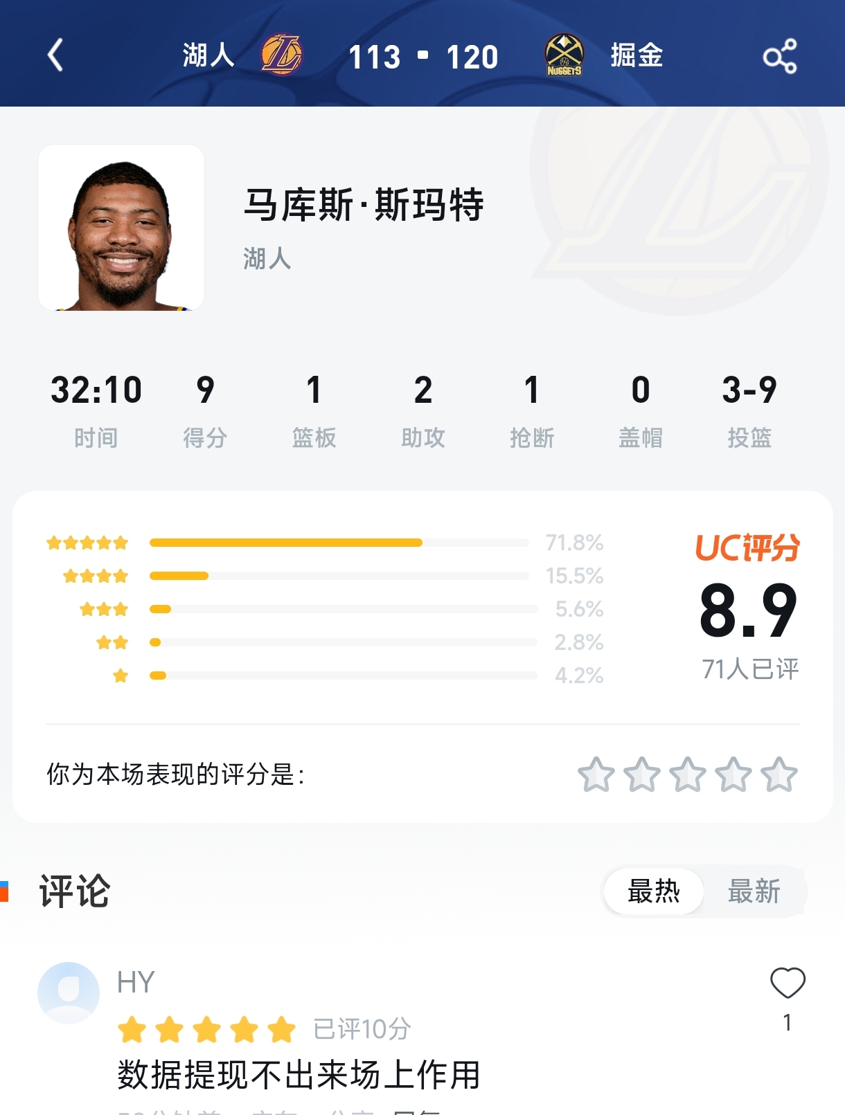 用户:数据蜜滚出克 评论:那些给一星的是不是就看数据表格了?今天这比赛,没斯玛特顶那几分钟,湖人三节就花了!