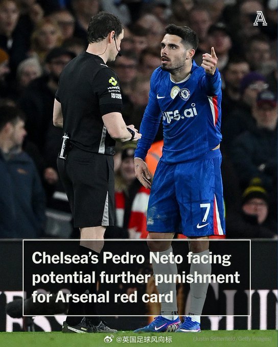 【内托红牌面临追加处罚】英足总官方确认,正式指控切尔西边锋内托,在对阵阿森纳比赛中,两黄变一红被罚下后,对主裁达伦-英格兰有不当行为,包括未能及时离开球场,以及对官员使用辱骂性语言。球员除了自动停赛一场之外,还要面对英足总的进一步纪律指控。