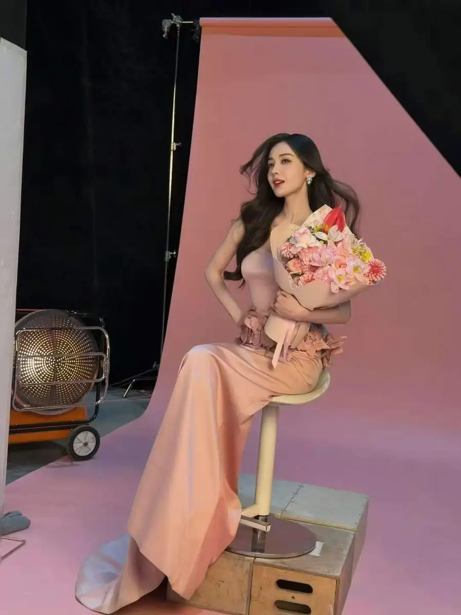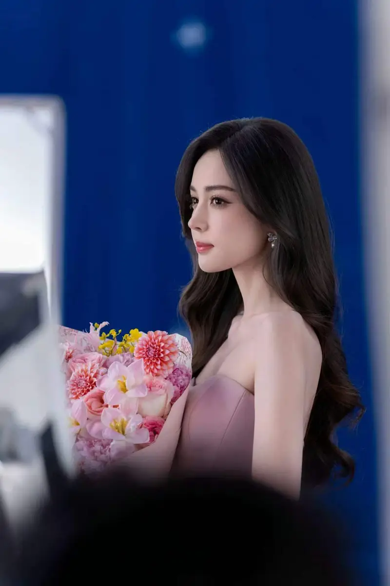 娜扎穿立体花饰粉裙手捧花束甜笑灿烂侧颜精致动人