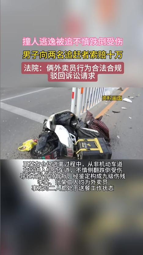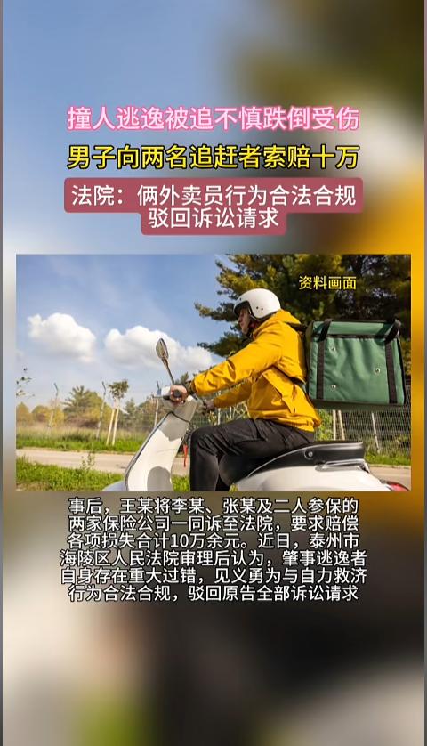 “必须严惩!”江苏泰州,一男子驾驶无牌电动车将一名外卖员撞倒后逃逸,路过的一位外卖小哥看见后立即追赶,被撞的外卖员起身后也加入其中。谁知肇事者在逃离过程中发生侧翻,造成骨折,竟反手将二人告上法庭,索赔十万元。近日,当地法院判了! 以往经常能见到一些新闻,明明是见义勇为,嫌犯受伤了,自己却要进行赔偿,寒了不少人的心。近年来,法不能向不法让步的呼声日益高涨。 据媒体3月6日报道,事发当日,王某驾驶无牌三轮车,在路上,把正常行驶的外卖员李某给撞倒了,王某并未停车,骑车逃逸。这时候,旁边路过的另一名外卖员张某看见了,立刻汽车进行追赶。 被撞的李某受了点伤,起身后也开始追赶。王某在逃窜中,不慎侧翻跌倒,发生骨折,事后鉴定为九级伤残。为此,王某将两名外卖员一同告上了法庭,要求对方赔偿十万元。 近日,法院做出宣判,王某肇事逃逸在前,自己存在重大过错。外卖员张某属于见义勇为,被撞者李某属于自力救济,二人合情合理合法,因此驳回了王某的全部诉讼请求。 网友看后表示,这个案子法院判的对,不能让见义勇为的人寒了心,更不能助长施害者的嚣张气焰。不过,这样太便宜肇事者了,应该另外立案追究他交通肇事罪,还得让他赔偿两位外卖员的误工损失! 信息来源:《撞人逃逸被追不慎跌倒受伤男子向两名追赶者索赔十万(现代快报)》半岛晨报