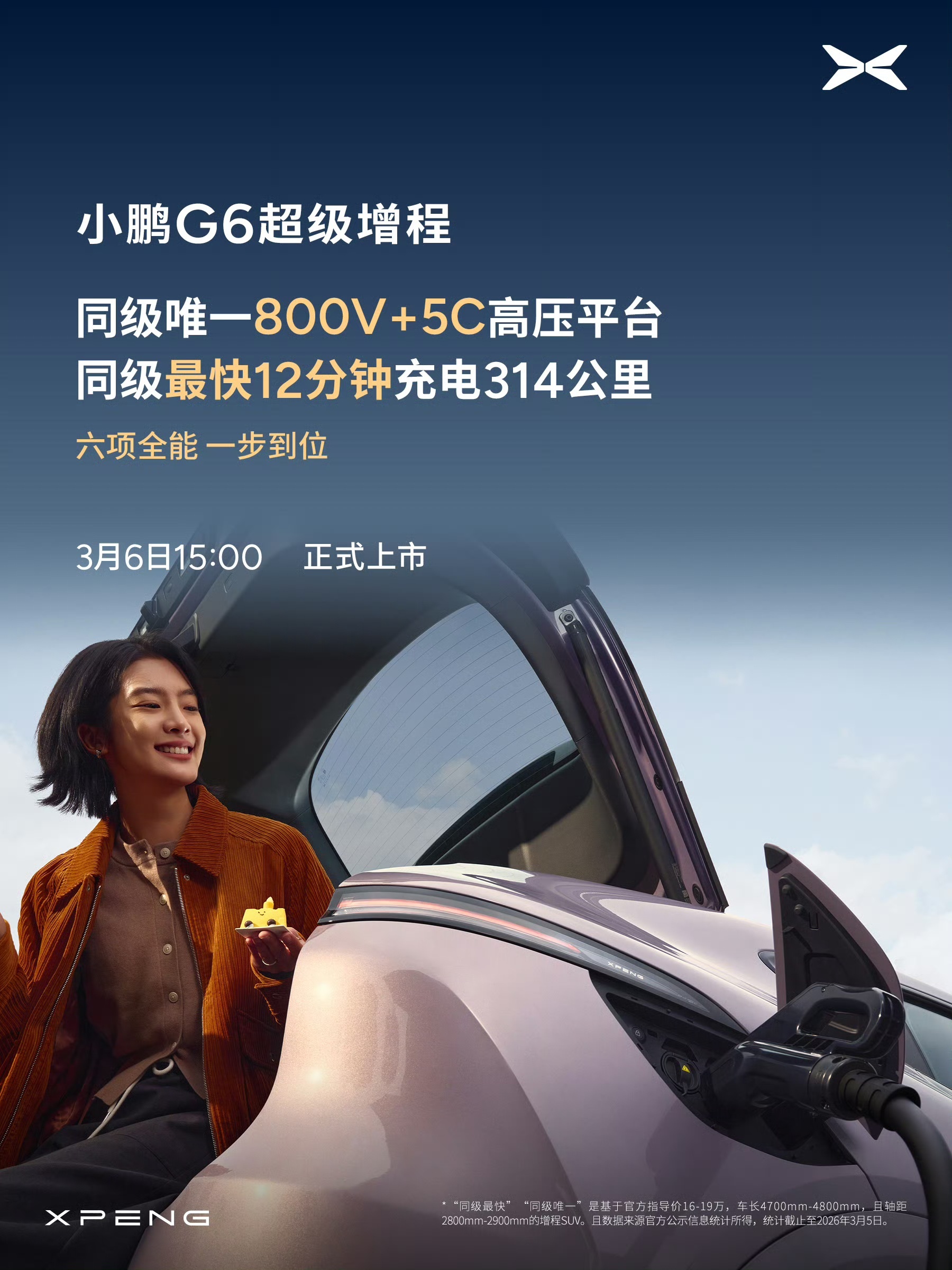 小鹏G6超级增程六项全能一步到位谁家用车还在纠结纯电还是增程?小鹏G6超级增程直接给出最优解,续航、智驾、舒适、安全全都拉满。今天15:00正式发布,综合续航1704公里,长途自驾说走就走;纯电续航430公里,市区通勤一周一充绰绰有余。800V+5C超快充,12分钟就能补能314公里,彻底告别充电焦虑。85.6%空间得房率,全家出行、带娃露营都够用。三重最高安全标准+一体式压铸车身,还有高速爆胎稳行、高阶AEB等配置,安全感拉满。太极AI底盘滤震舒适,转弯平稳,老人小孩坐着都舒服。更关键的是,20万内就能用上L4级能力的第二代VLA智驾,好开又靠谱。没有短板、不用妥协,家用SUV六项全能一步到位,这才是家庭用车该有的样子。