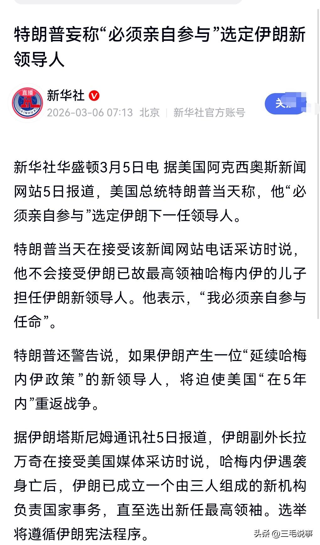 特朗普这也太嚣张了吧,难道他不知道人狂必有祸吗? 有媒体5日报道,特朗普:我要亲自挑选伊朗新领导人。 他竟然还想亲自挑选伊朗新领导人。 这也太不把伊朗的主权放在眼里了吧,这是公然干涉他国内政啊。 不过特朗普一向是无法无天的。
