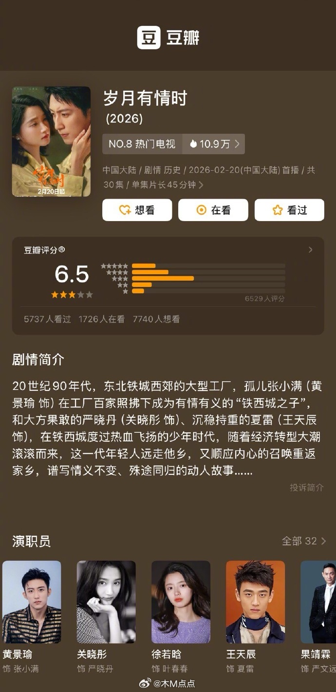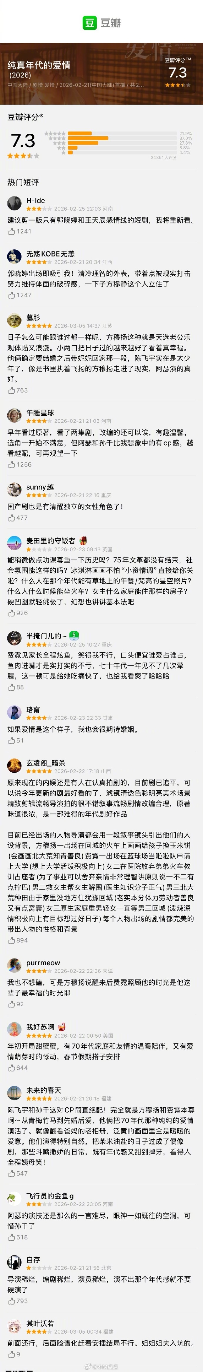 两部年代剧开分陈飞宇、孙千《纯真年代的爱情》豆瓣开分7.3分黄景瑜、关晓彤《岁月有情时》豆瓣开分6.5分