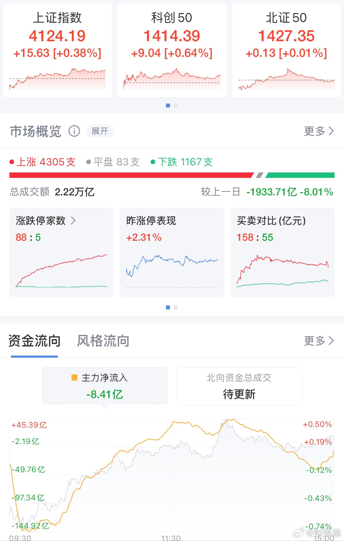 3月6日,A股三大指数集体收涨,沪指低开高走涨0.38%,报4124.19点;深证成指涨0.59%,创业板指涨0.38%,北证50指数涨0.01%。沪深京三市成交额22192亿元,较前一日缩量1933亿元,全市场超4200只个股上涨,呈现普涨格局。