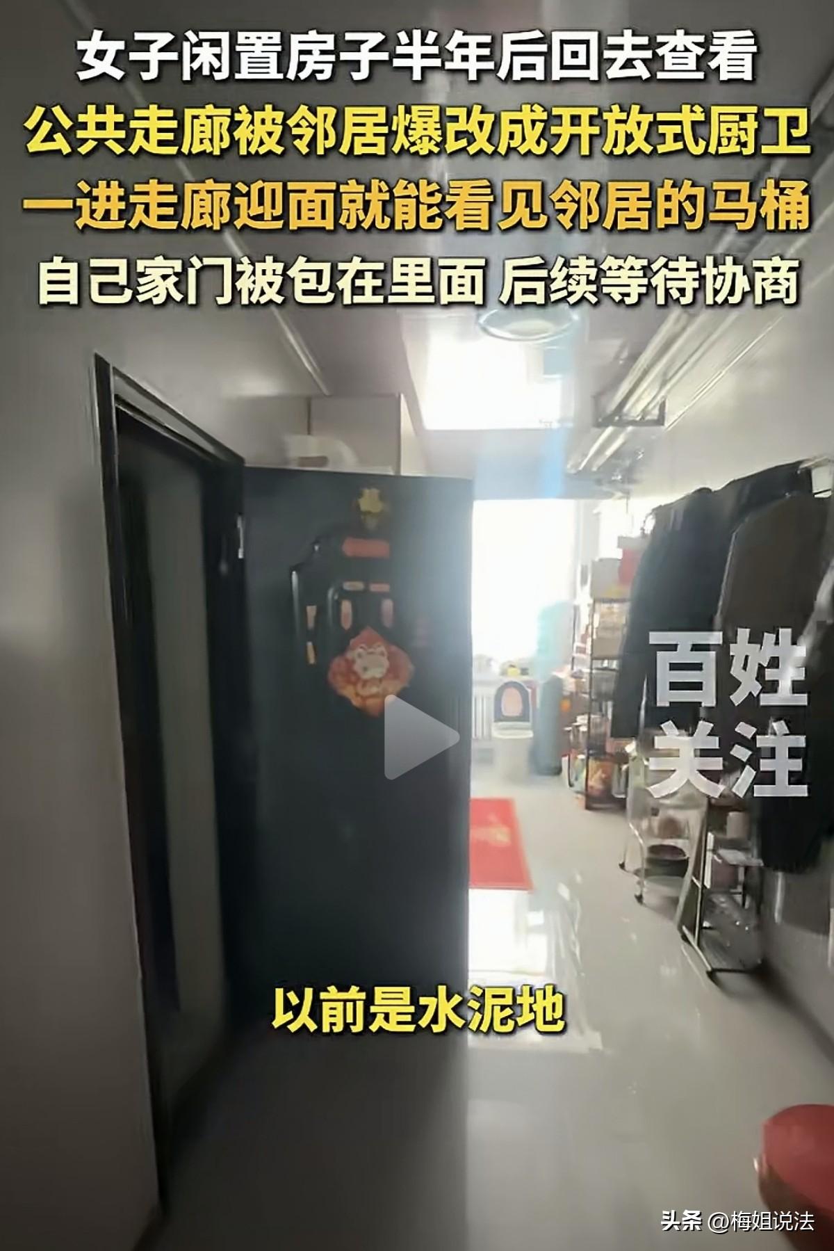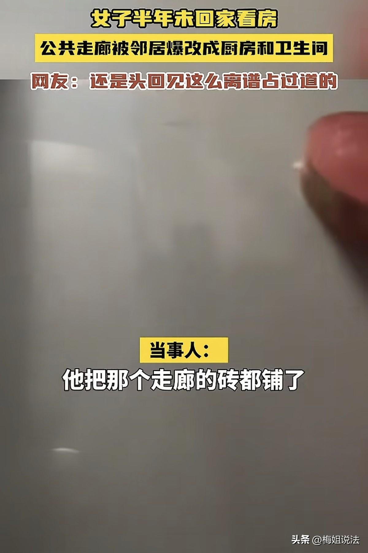 内蒙古,一女子名下有多套房产,其中一套房子半年前去查看的时候还好好的,半年后再次回去后发现“天塌了”!房子门口的走廊被邻居霸占并爆改成厨房卫生间,还安装了坐式马桶!这让女子感到惊讶又无奈,不能这样做吧? 据悉,女子在一个老旧公寓楼内有一处闲置的房产,明明是水泥楼梯和水泥地,一上到自己家的楼层就看到,公共走廊上的地面铺满瓷砖,甚至连天花板都安装好了。 定睛一看,走廊就像个开放式厨房,该有的东西应有尽有。安装了上下橱柜、抽油烟机、灶台,锅碗瓢盆调味料样样俱全。 不仅如此,橱柜里面是一个开放式的卫生间,有抽水马桶、洗漱台,还有洗衣机,全部都安装好并且是可以正常使用,还单独留了一块区域来晾衣服。 女子发现自己的家门被层层包围,惊讶于邻居可以这么爆改走廊过道的同时,也觉得好笑和无奈。 走廊过道属于公共区域,邻居这么做虽然看起来很美好,把厨房和卫生间转移到过道中,室内空间得到释放,却完全忽视了周围住户的想法和感受。那邻居这样的做法是合理的吗? 完全相反,邻居的做法不仅不合理,而且不合法,并且还存在消防安全隐患! 楼道里的走廊是公共空间,在买房子的时候,除了房子本身的实际面积之外,还要为一部分的公摊面积进行付费,而走廊就是这种公摊面积的典型区域,此外还包括楼梯、电梯等区域。 既然已经付过钱了,所以楼层里的走廊其实是住户们共同享有的,假如在自己家门口放个鞋柜、放个储物架呀,这合情合理。 但是把走廊这样的公共区间包改成厨房和卫生间就非常过分,这侵犯了左邻右舍对走廊具有的权利。 并且女子半年没回来,没有听到过邻居的沟通、协商,甚至连通知都没有,在毫不知情的情况下,邻居又以什么样的理由能够随意改造走廊呢? 《民法典》第二百一十七条规定,业主对专有部分以外的共有部分,如楼道,则享有共有和共同管理的权利。 这意味着,谁都不可以在其他业主不知道的情况下,自己擅自占用走廊这样的公共区域。 在很多实际的案例中,这种擅自占用公共楼道区域的情况都会被认为是对其他业主实际权益的侵害。 更为重要的是,这涉及到了消防安全的隐患和风险问题。 可以想一下,走廊里是没有安全插座、天然气输送管道接口和水管接口的,但是邻居改造出可以实际使用的厨房灶台、洗手池和洗衣机。 这改变了这层楼的水电气连接结构,私自搭建的也可能会因为知识不够丰富、操作不够规范、技能不够专业的情况,从而导致存在巨大的安全隐患。 此外,《消防法》第二十八条规定,任何单位、个人不得占用、堵塞、封闭疏散通道、安全出口。 走廊就属于疏散通道,特别是女子的该处房产处于老旧小区,假如出现火灾等情况,这么多柜子和物件,有可能会挡住通道,更有可能成为逃生和救援的阻碍物,安全风险显著增加。 目前,女子已经跟邻居取得联系,想要对走廊的情况进行沟通,希望能够得到相应的解决办法。 如果邻居执意不知悔改,可以通过物业公司进行劝阻,或者直接提起民事诉讼。 即使女子不在该处房子居住,也不能成为邻居肆意妄为和侵害别人权益的理由。 对此,您有什么看法?欢迎留言交流。