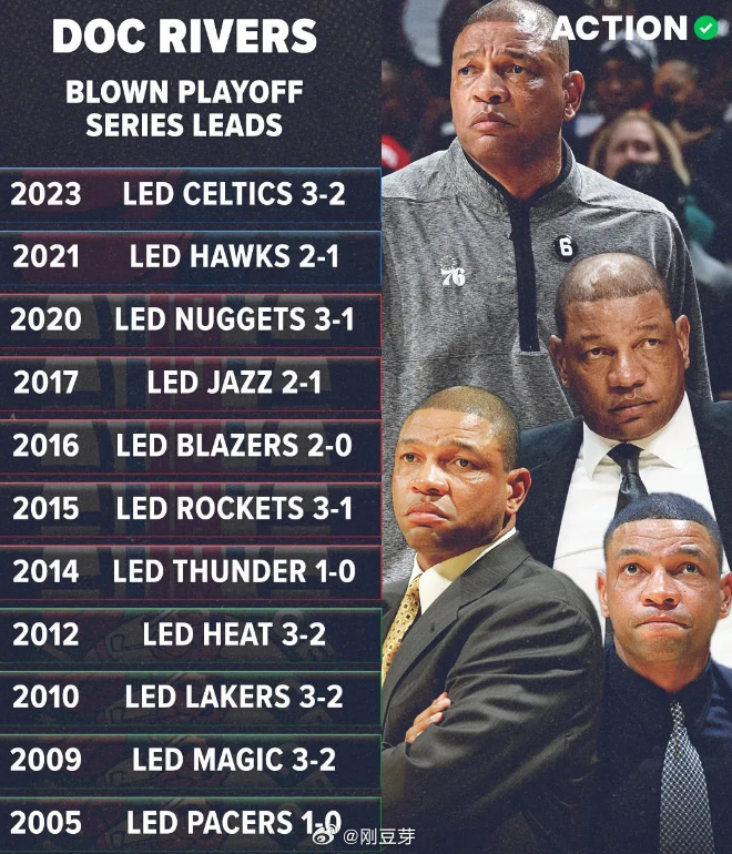 里弗斯可以说是NBA相当传奇的教练了,执教生涯连续18年执教的球队在常规赛的胜率超过50%,常规赛取得1189胜排名NBA历史第六,拿到过14次月最佳教练和1次年度最佳教练。但是在季后赛上却7次3-2领先时被翻盘,10次输掉了抢七大战,32次输掉了能终结系列赛的比赛。