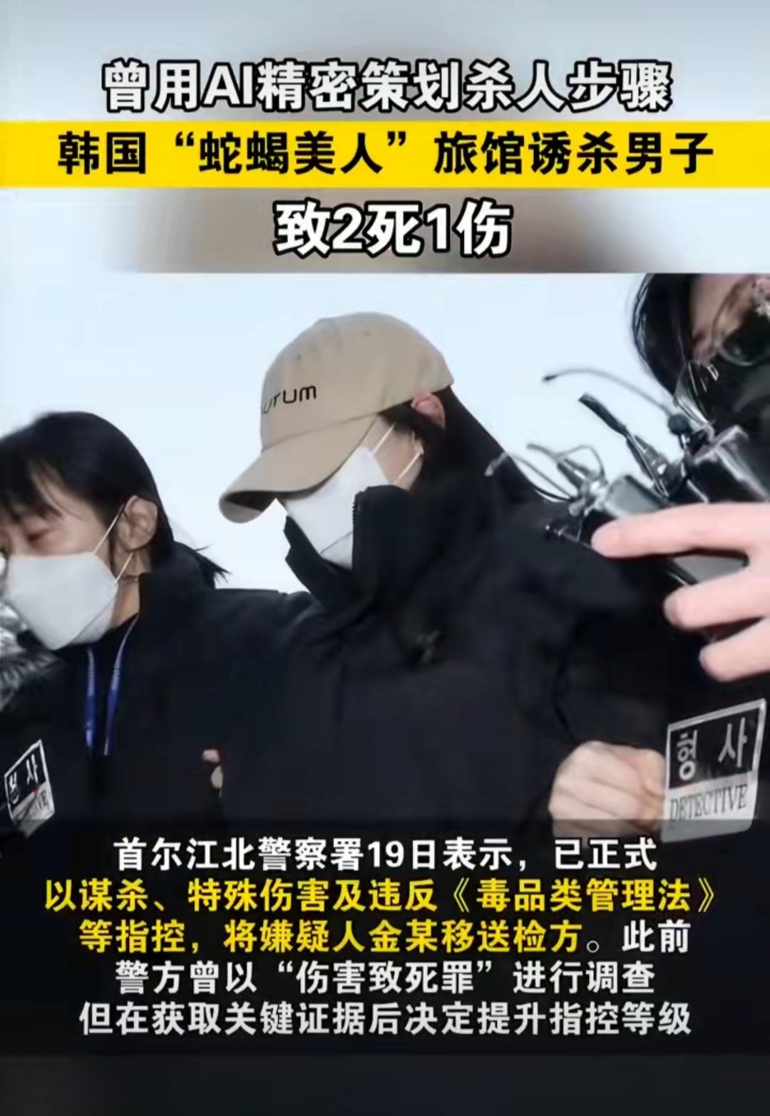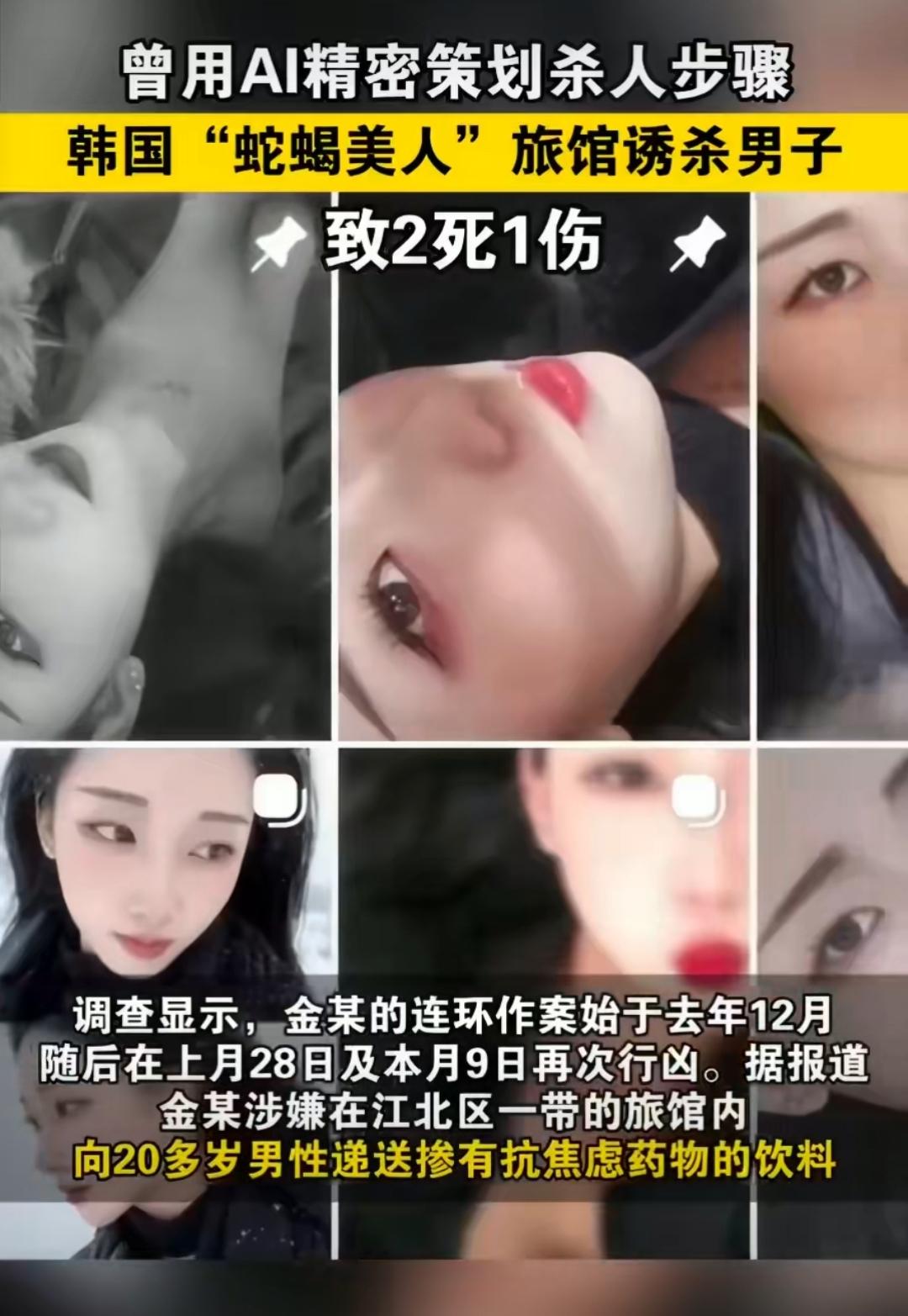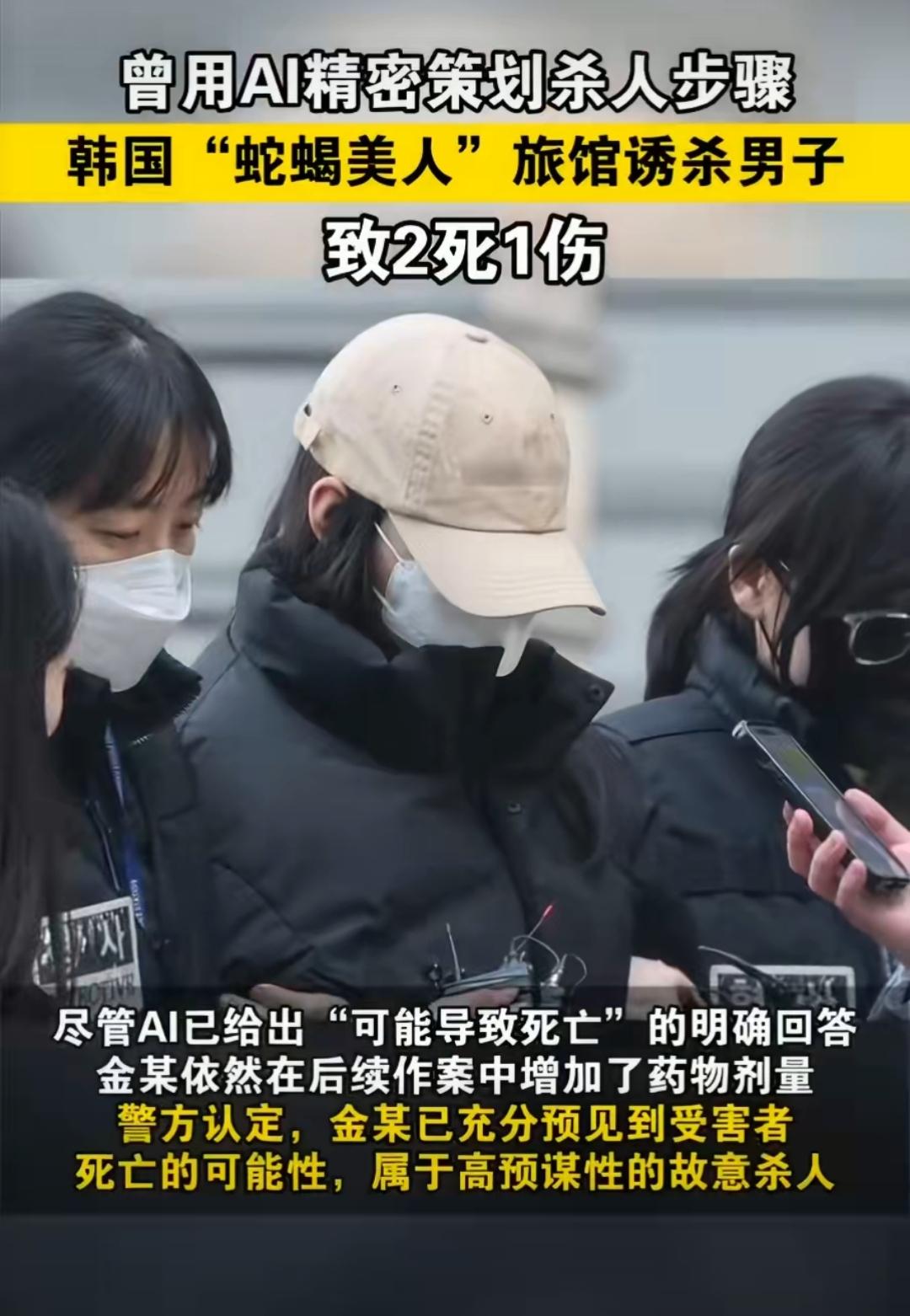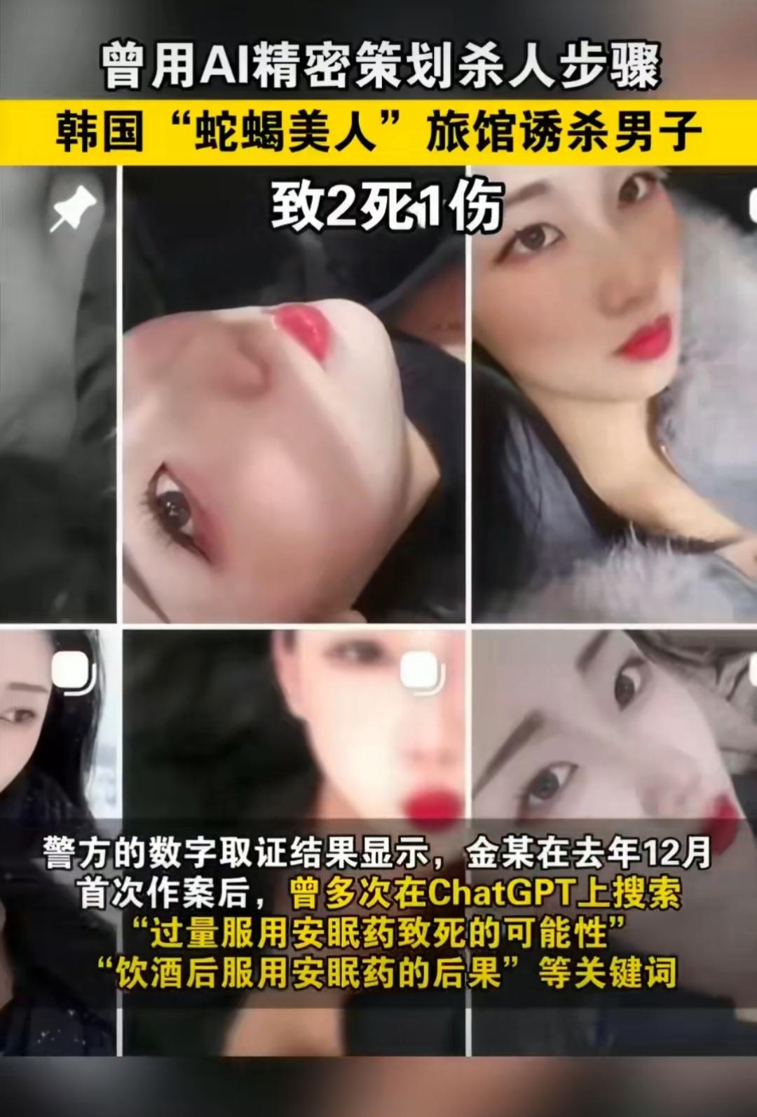 韩国一女子用ChatGPT策划连环杀人,先后在汽车旅馆诱杀3名男性,致2死1伤。被捕后因其颜值清纯可人,不但涨粉50倍,韩国网民还呼吁:漂亮即无罪、应该减刑…韩国不但女拳疯魔无脑,连这帮男网友也是色心入脑![吐舌][看][看]国外命案 韩国美女杀人案 情侣被杀案