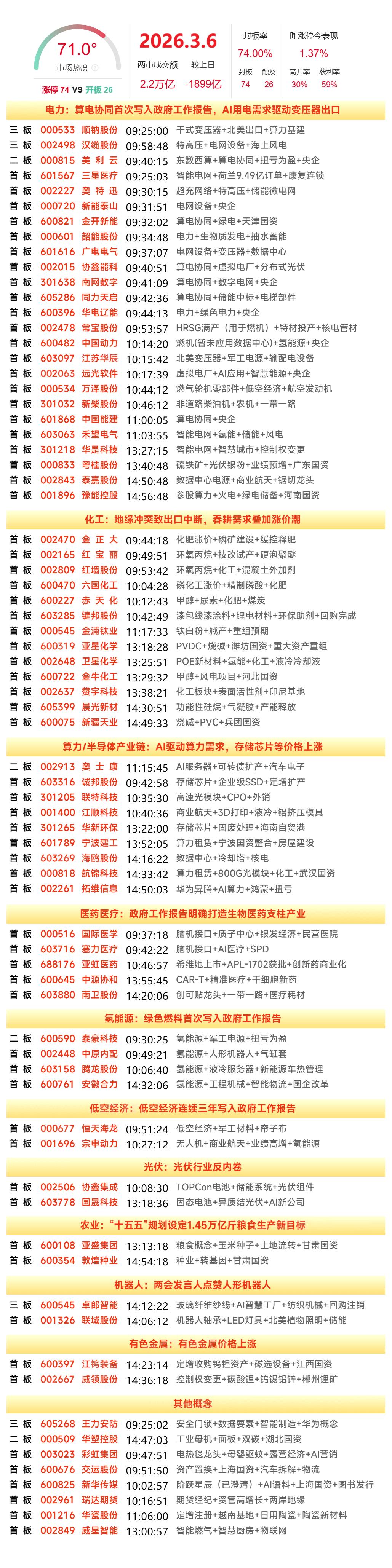 3月6日涨停复盘|智能电网、燃气轮机持续大涨,化工、数据中心等也有不俗表现