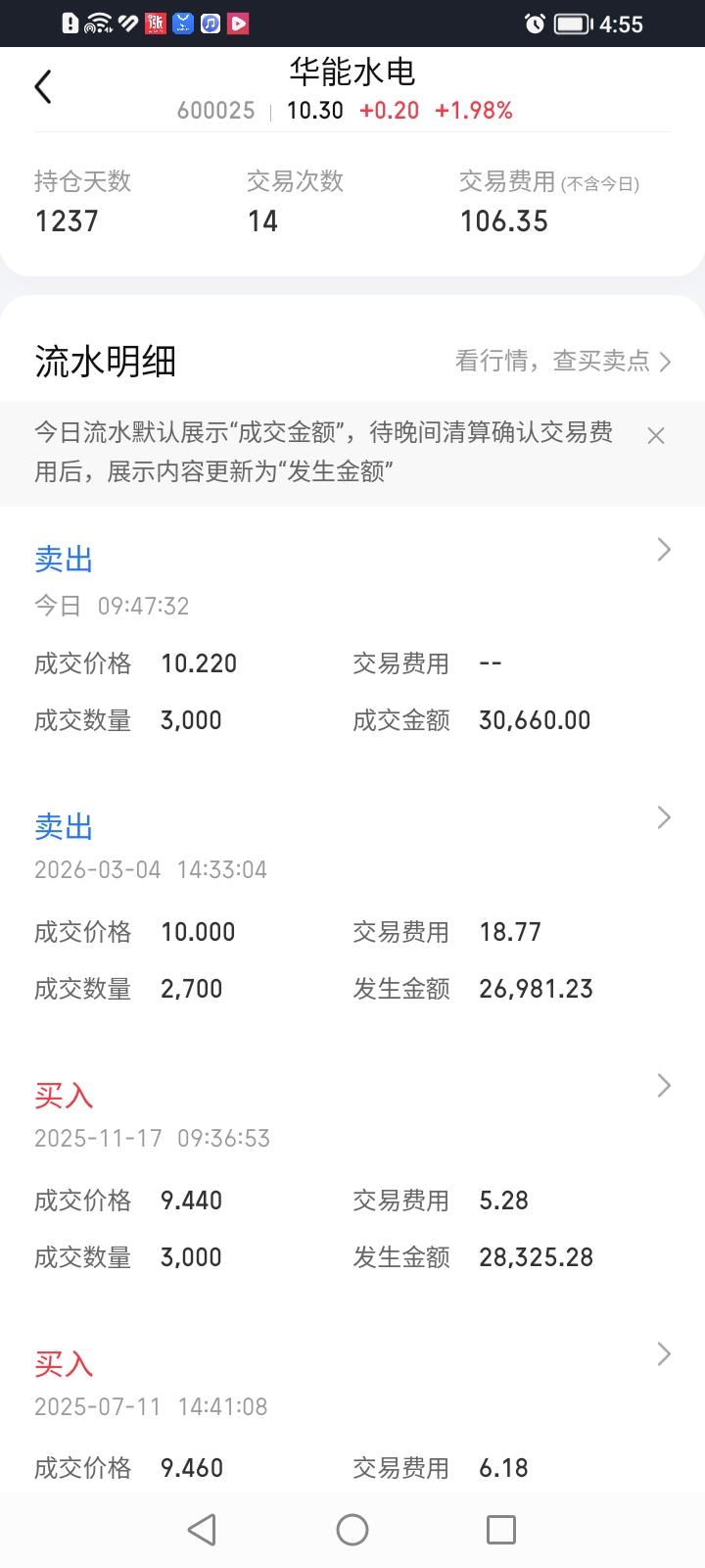华能水电你到底要闹哪样?竟然走出了创新高的七连阳! 华能水电今天收盘上涨1.98%,收盘价10.30元,收盘价直接创出了15个月以来的新高。 今天咱不信邪,满以为它不会直接创新高的,就故意挂了个10.22元的卖单,没想到在9:49分就被吃掉了。 难道这一次咱又要重蹈覆辙?上一波行情也是咱在8元多把筹码卖掉了大部分,结果它一口气冲到了12.30元。这次看它能冲到多少?