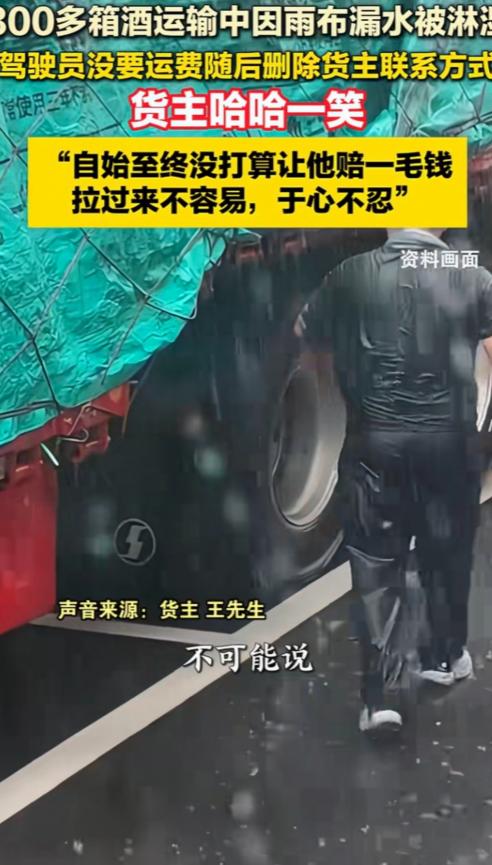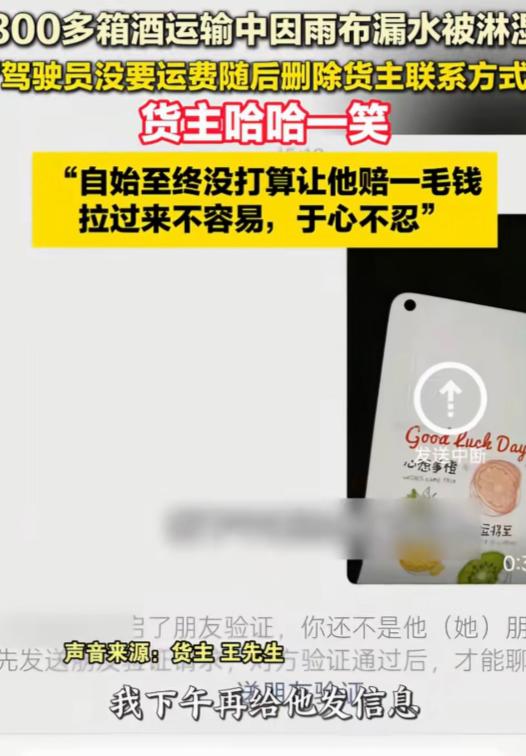“老板大气!”安徽,男子找一货车司机运送345箱酒,送到后,他掀开雨布发现最少有300箱酒被淋湿,司机说:340元运费我不要了,你看咋弄吧。然后,开车走了。等男子给司机发信息协商时,不料,对方竟然把拉黑,微信也删除了。男子无奈,哈哈一笑说:我从来没打算让他赔一毛钱。之后,说了一番话令人感动。网友:司机格局小了。 安徽宿州,一场雨夜,345箱酒水被淋成了废品。 货主王先生揭开雨布瞬间,呆立当场。眼前之景,令他难以置信:至少300箱酒的外包装软塌变形,水渍遍布,标签模糊难辨字迹,一片狼藉之象。做酒水生意的都懂,这意味着什么:就算里面的酒没坏,光凭这副卖相,客户多半不会要。要么砸手里,要么贱卖处理,几万块的损失跑不掉。 司机伫立在旁,脸色惨白如纸,那副模样着实骇人。他双腿微微颤抖,眼神中满是惶恐,似被极度的恐惧所笼罩。他丢下一句"340元运费我不要了,你看咋弄吧",转身上车,油门一踩就消失在夜色里,连个商量的机会都不给。 王先生当时没拦他。他想着,司机可能需要时间冷静冷静,回头再联系也不迟,大家坐下来好好谈谈,总能想出解决办法。结果到了下午,他拿起手机准备发消息商量赔偿的事,屏幕上却跳出一行字:"你还不是他朋友。" 微信被悄然删除,拨打电话亦是忙音不断。那人如断线风筝,消失于茫茫人海,彻底与我失去了联系,徒留满心怅惘。这是要玩人间蒸发啊? 换成别人,这会儿估计已经气炸了,货损摆在那儿明明白白,责任人却玩起了消失,这不是明摆着耍赖吗?正常人第一反应肯定是报警、找律师、追到底。但王先生的反应却让所有人意外,他只是无奈地笑了笑,说了句特别扎心的话:"我从来没打算让他赔一毛钱。" 此言甫出,周遭众人皆惊愕不已,一个个如遭雷击,呆立原地,满脸的茫然无措,现场瞬间陷入一片死寂。不是,你损失这么大,怎么还替对方说话? 王先生的理由质朴而实在:跑货车者,披星戴月、栉风沐雨,油费、过路费、车损皆需自担。这趟340块的活儿,本就所获无几,除去成本,或许仅赚百八十块。现在货出了问题,如果真让司机赔,那可不是赔一点点,300箱酒的损失,少说也得几万块,这对一个靠体力吃饭的人来说,可能就是几个月白干,甚至还要倒贴家底。 我岂会在第一时间便心生邪念,妄图让他人赔偿数万元?这般想法实在是对我的无端揣测,断非我之所为。王先生轻轻摆了摆手,语调格外平静,说道:“深更半夜驾车而来,耗费燃油运送货物,已然十分辛劳。”咱要是再让他掏钱,实在于心不忍。" 对于那些被淋湿的酒,王先生早有应对之策:包装损坏严重的便拆箱零卖,若此法行不通,就降价出售,无论如何,总能售出一部分。他并未将这些损失萦怀于心,更未因此锱铢必较,非要对司机不依不饶。 此事一经在网络上传播,评论区瞬间沸腾起来,好似炸开了锅一般,各种观点与言论如潮水般涌来,热闹非凡。 有人说,王先生这才叫真正的格局,明明占理,明明可以理直气壮地要赔偿,却没有得理不饶人,反而体谅别人讨生活的难处,这份厚道在现在这个社会特别难得。这年头,能吃点亏不计较的人,真的不多了。 亦有人为司机深感惋惜,若其当时未逃逸,而是留下诚恳沟通,即便赔偿与否、如何赔偿后续再细商,也远胜直接甩手、拉黑失联,如此更易令人信服。说不定王先生看他有担当,念着他的难处,以后的货还会继续让他拉,这不就是长期饭票吗?但现在这么一搞,不仅丢了信誉,还把一个潜在的长期客户给彻底推开了。此后于这圈子之中,还有谁敢启用他?如此行径,已然令其信誉扫地,再难获他人信任,谁敢将重要之事托付于他? 从法律上讲,司机确实该担责。《民法典》第832条写得明明白白:承运人对运输过程中货物的毁损承担赔偿责任,除非能证明是不可抗力。寻常降雨并非不可抗力因素。雨布覆盖欠佳致其漏水,此乃防护疏漏。在此情形下,司机难辞其咎。王先生要是真想追究,法院判下来,司机一分钱都跑不掉。 但王先生算的不是法律账,是人情账。他深谙普通人赚钱之艰辛,故而未对对方刻意刁难。即便会遭受损失,他亦选择独自承受,这份体谅与担当令人动容。这份将心比心的体谅,比争个输赢更值钱。 在生活的纷扰中,诸多纠纷常现。此时,责任与义务应泾渭分明,而人情世故亦需妥善考量,二者当有所区分,不可混淆。遇事别先想着躲,好好沟通,大多事都能商量着来。司机该有担当,货主也有宽容的余地,互相体谅,少点计较,路才能走宽。 王先生凭借大度,巧妙化解了一场本可能升级的矛盾。他坚守原则底线,却也未将司机逼入绝境,于情于理皆处理得当,尽显处事智慧。这种做法不是"怂",而是心里有数,多一分理解和善意,有时候比什么都管用。 此乃真正之格局,彰显做人之睿智。格局宽广,方能海纳百川;智慧在身,才可从容处世。如此,方为人生至境。