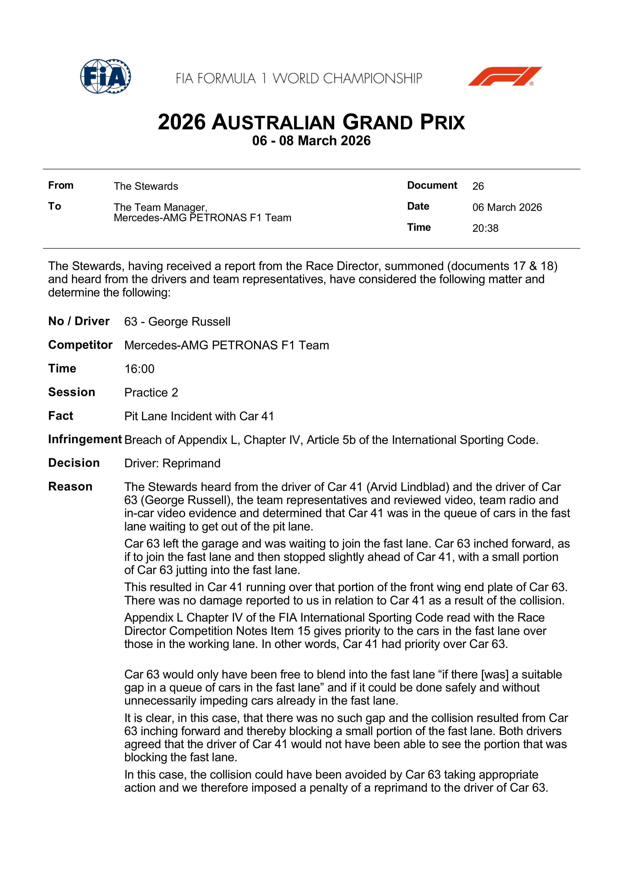 拉塞尔因为FP2和林德布拉德在维修区发生剐蹭,被赛会训诫1次