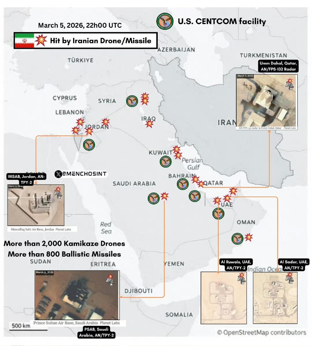 截至3月5日,通过卫星图像可以确认的美军已受损或者被摧毁的高价值雷达位置分布,包括了4套“萨德”反导系统,以及一座“铺路爪”远程预警雷达。 需要注意的是,目前其实只有约旦和沙特部署的AN/TPY-2雷达确认被摧毁了,阿联酋的是2两套“萨德”反导系统阵仗也确实被伊朗攻击了,但具体战果尚未确定。
