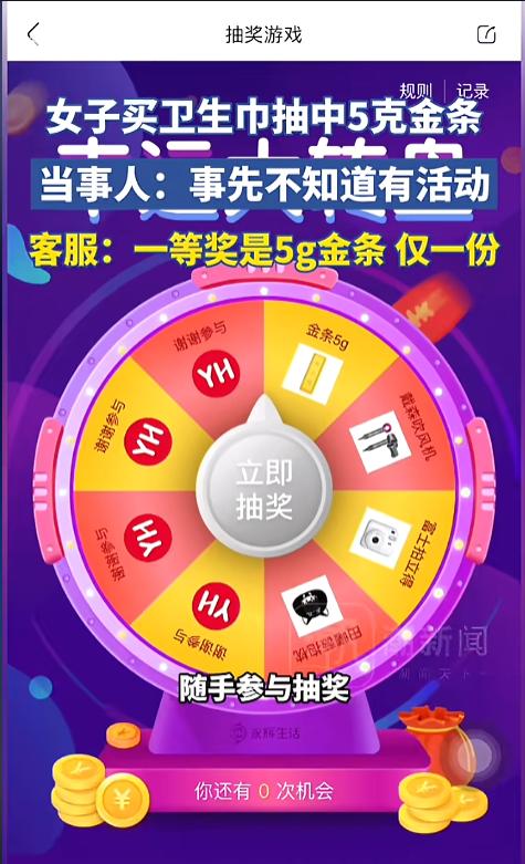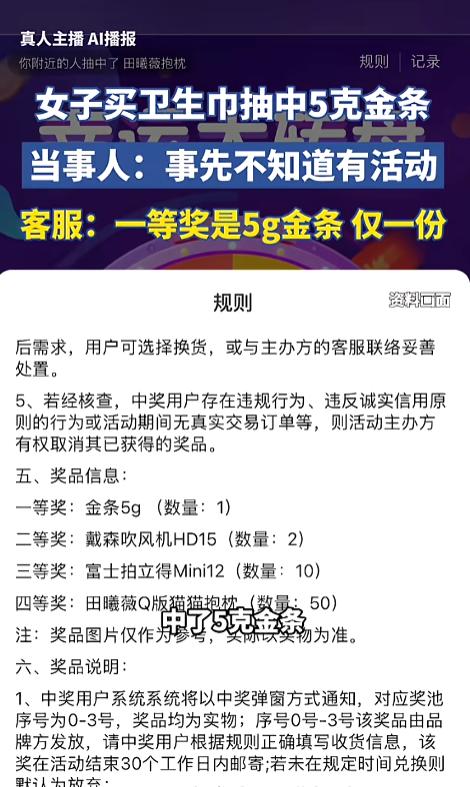 “天上掉馅饼了!”近日,辽宁,一女子买卫生巾后随手抽了个奖,不久后收到信息,显示自己中了5克金条。女子大喜过望,赶紧联系了超市,超市回复说活动是真的,奖品将会通过快递进行寄送,全国仅此一份。网友:好几年的卫生巾钱都有了! 黄金的价格持续看涨,看得人心跳不已。不少商家为了吸引或回馈客户,也在抽奖活动中设置了黄金奖项,就等着锦鲤来抽了。 据媒体3月5日报道,事发当日,该女子从超市APP下单了一份卫生巾,并选择了及时达配送服务。付完款后,她发现APP弹出来了一个抽奖活动,她也没在意,随手抽了一下。 没过多久,女子收到了一条中奖信息,显示她中了5克金条。女子瞬间不淡定了,按当日金价,价值将近七千多呢。想到这儿,女子赶紧跟超市客服进行了联系。 客服明确的告诉她,活动是真实有效的,中奖信息会直接发送给个人客户。据他介绍,这个黄金大奖,全国也仅有一份,而且是仅限及时达配送用户参与。对方也确认,奖品会通过快递的方式进行寄送。 网友看后表示,这运气也太逆天了,赶紧来沾沾欧气,希望以后自己也能锦鲤附体。同时也提醒大家,遇到中奖活动时,顺其自然就好,没有必要为了参与活动而大肆消费。毕竟也强求不得! 信息来源:《女子买卫生巾抽中5克金条,当事人:事先不知道有活动,客服:一等奖是5g金条 仅一份》潮新闻