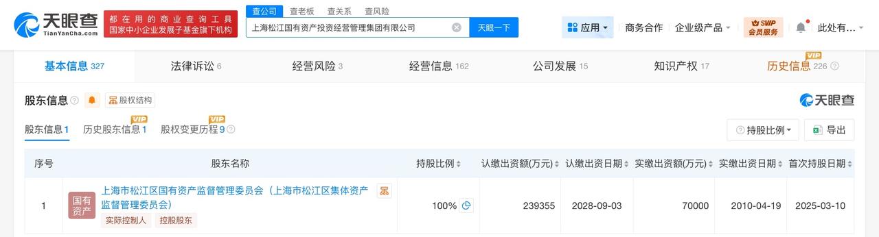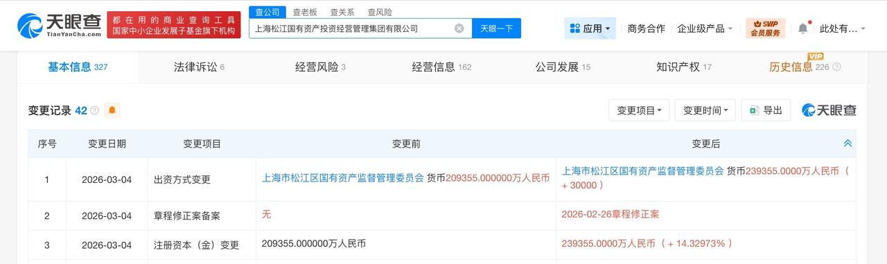 上海松江国有资产投资经营管理集团增资至23.9亿 增幅约14% 天眼查工商信息显示,近日,上海松江国有资产投资经营管理集团有限公司发生工商变更,注册资本由约20.9亿人民币增至约23.9亿人民币,增幅约14%。 该公司成立于1998年9月,法定代表人为谈庆,经营范围为本区资产经营、管理、置换、投资。股东信息显示,该公司由上海市松江区国有资产监督管理委员会全资持股。 天眼查信息:
