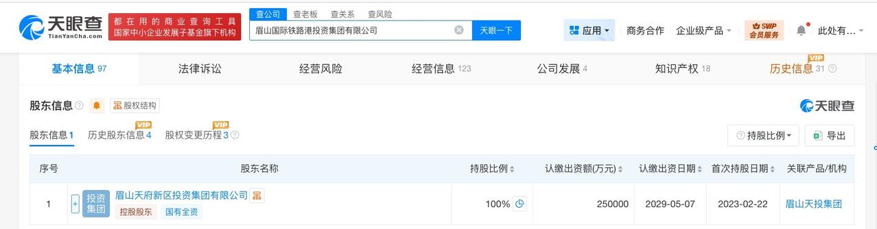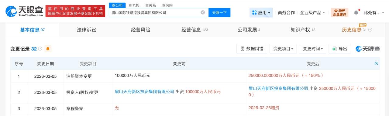 眉山国际铁路港投资集团增资至25亿增幅150% 天眼查工商信息显示,近日,眉山国际铁路港投资集团有限公司发生工商变更,注册资本由10亿人民币增至25亿人民币,增幅150%。 该公司成立于2001年10月,法定代表人为吴东,经营范围包括以自有资金从事投资活动、供应链管理服务、国内货物运输代理、国际货物运输代理等。股东信息显示,该公司由眉山天府新区投资集团有限公司全资持股。 天眼查信息: