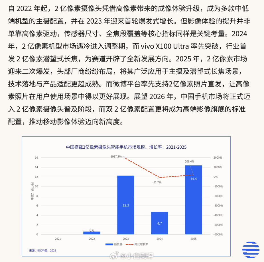 IDC:2026年中国手机市场2亿像素摄像头将进入全面普及阶段。
