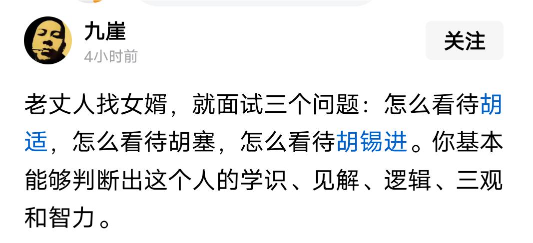 头条作者提出一个问题,他让人评论胡适、胡塞和胡锡进,看谁更适合娶他女儿,当他的女婿。 我的看法是这样: 首先,胡适跑去美国学了一套美式自由观,又自以为有才情,所以非常滥情。这货不但勾搭过自己的小姨子,媳妇最终以死相逼才没离成婚,而且这货还喜欢嫖娼,没事就去逛八大胡同。所以,胡适这种人虽然名气大,还有一大堆博士帽,显然不配做女婿。 其次,胡塞拖鞋军那种人又穷,又一身反骨,跟谁都不服不忿,闲着没事就跟人对拼,打的你死我活。这种人相当于又穷又横,在社会上容易挨揍,好像也不咋样。 所以,我建议这位头条作者选女婿,选女婿还是选胡锡进吧。别看老胡喜欢左右横跳,好歹人家退休金高,还搞自媒体,到处演讲,有名气又有钱。把女儿嫁给他,总要好过胡适和胡塞。