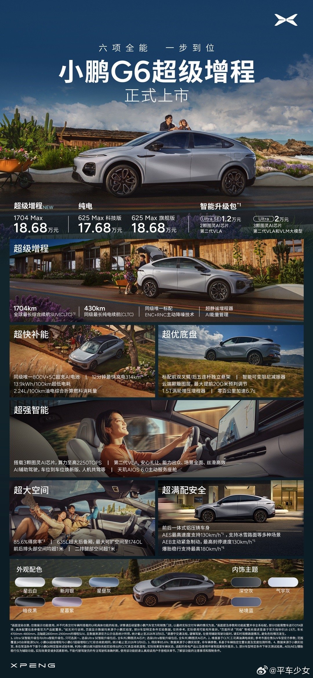 限时福利也没落下,3月31日前下定,至高33200元权益,补贴、置换、配置全都送!小鹏G6超级增程六项全能一步到位何小鹏称G6将第二代VLA带入20万内