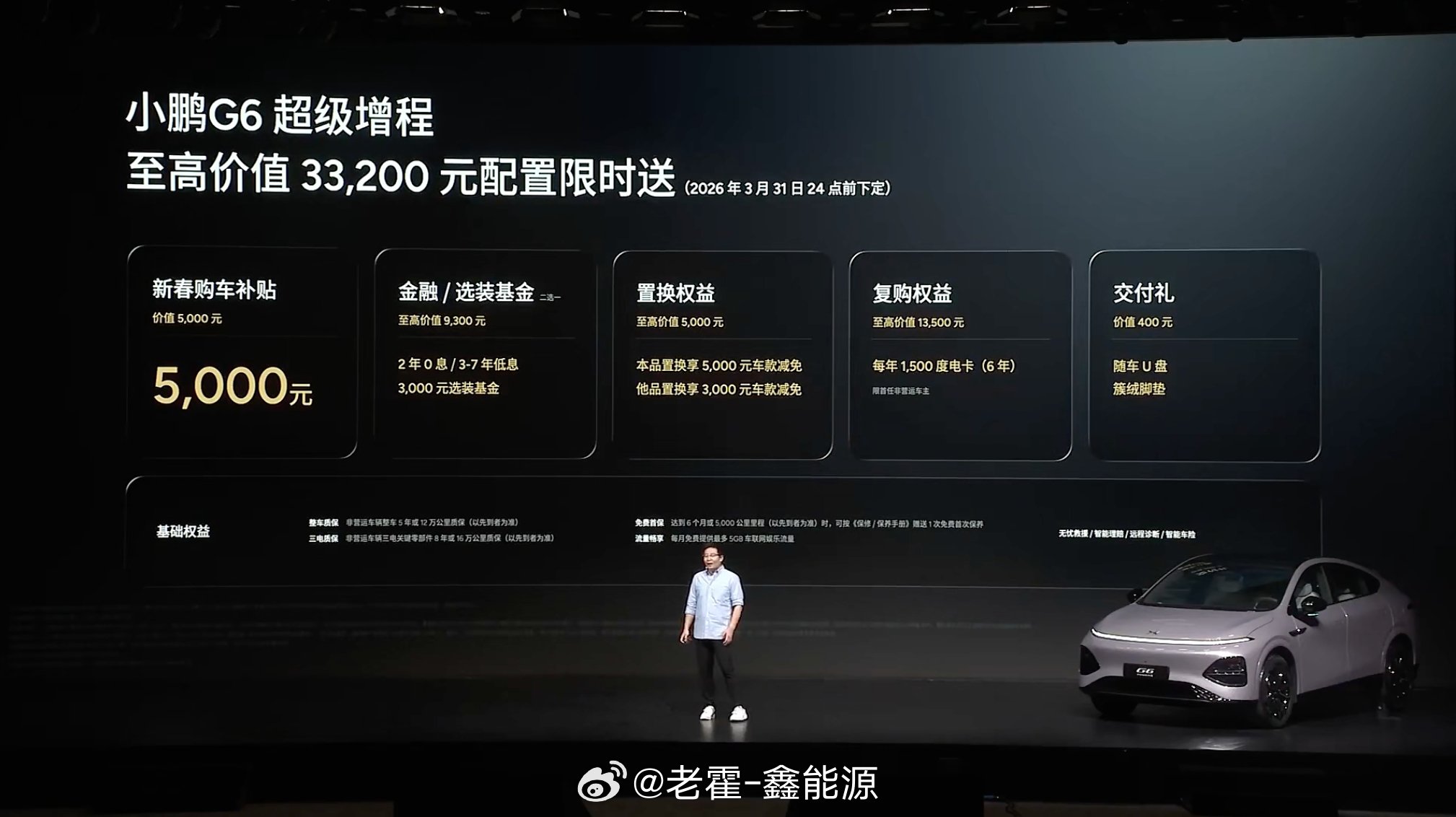 即日起至2026年3月31日24点前下定,可享最高价值33200元限时权益礼包:-5000元新春购车补贴-至高价值9300元金融/选装基金(二选一)-至高价值5000元置换权益-至高价值13500元复购权益-价值400元交付礼大v聊车小鹏G6超级增程六项全能一步到位