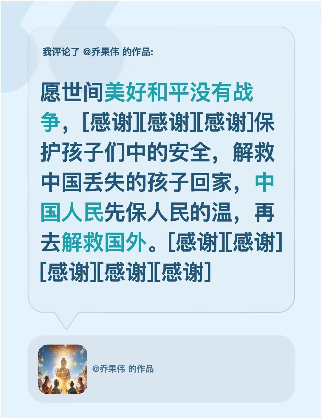 我评论了@乔果伟 的作品:愿世间美好和平没有战争,[感谢][感谢][感谢]保护孩子们中的安全,解救中国丢失的孩子回家,中国人民先保人民的温,再去解救国外。[感谢][感谢][感谢][感谢][感谢]