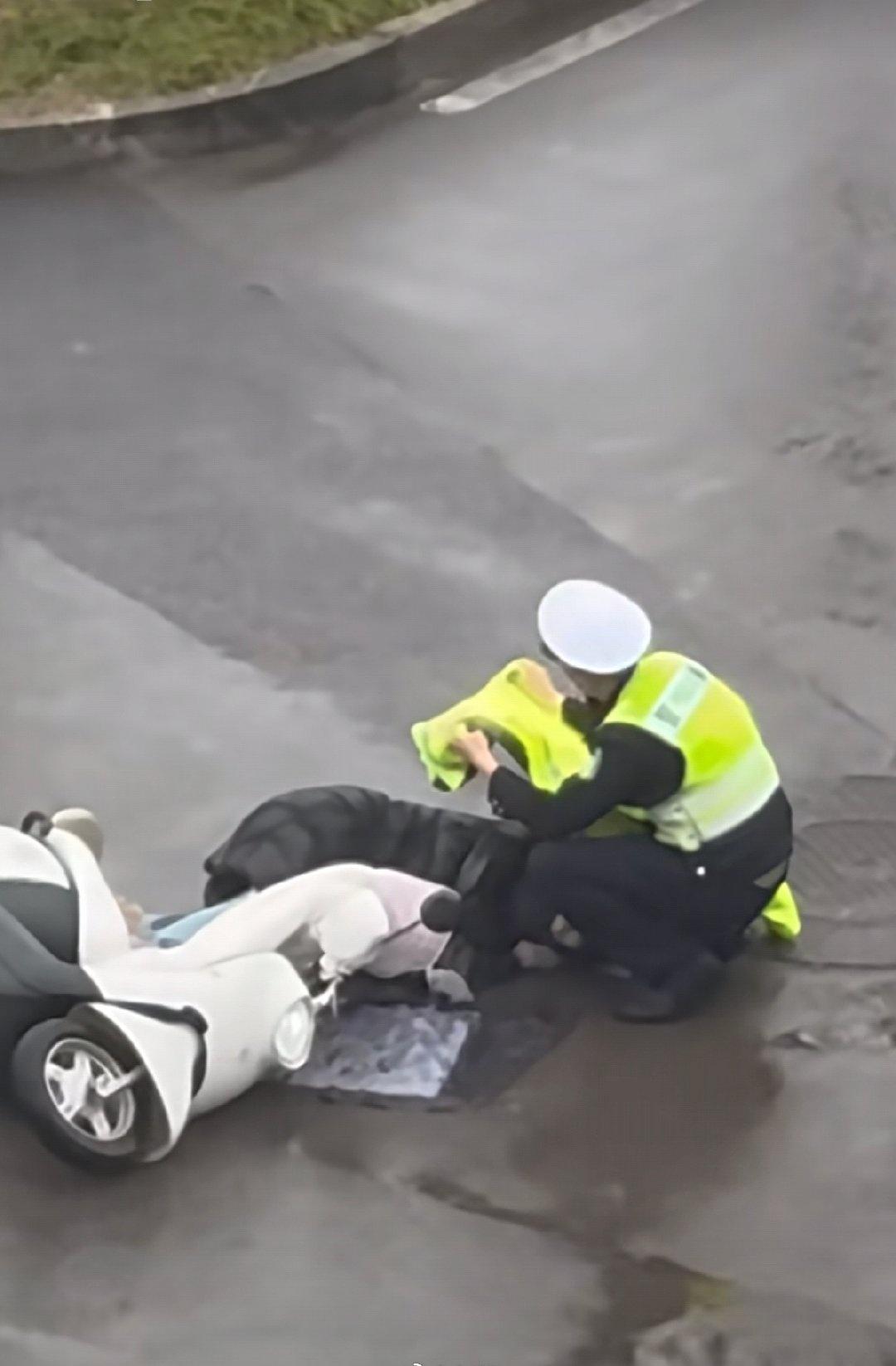 近日,在铜陵市街头发生暖心一幕,一名女子驾驶电动车时因路面湿滑摔倒在地,无法动弹。铜陵市公安局交警张贤能巡逻途经现场,立即上前查看,为防止二次伤害,他一边呼叫救援,一边脱下身上雨衣为受伤女子遮风挡雨。 张贤能蹲在一旁将雨衣遮在受伤女子头顶 张贤能告诉合新闻记者,当天他正在辖区内巡逻,行至路口时发现一名女子摔倒在雨中,当即拨打120急救电话和110报警电话。考虑到警车的防护作用,张贤能便将警车停在现场做好安全防护。 “作为一名警察,我不能就这样干看着。”张贤能告诉记者,当天雨下得很大,见女子躺在冰冷的雨水中,他便脱下自己的警用雨衣,蹲在一旁将雨衣遮在该女子头顶,全程守护等待救援。 “通过现场痕迹判断,应该是急刹车加上雨天路滑引发的事故。”张贤能回忆,女子因前方车辆经过路口时急刹车,自身避让过程中路滑摔倒。张贤能在询问中得知,女子称自己臀部剧痛且伴有头晕,因担心盲目搀扶造成二次伤害,所以他始终保持女子倒地姿势,仅将其头盔取下放置一旁,避免硌压头部。 救护车抵达后,张贤能协助医护人员将女子抬上救护车,此时他的警服已被雨水打湿。整个救助过程,张贤能全程寸步不离,密切关注女子的身体状况,直至救援车辆离开。 事发地距离附近医院仅有两个红绿灯的距离,救护车在3分钟内便抵达现场。经诊断,女子为轻微骨折,无生命危险,目前已无大碍。 张贤能工作照 “我自己觉得这是一件很小的事情,换作其他同事也会这样去做。”面对网络上收到的暖心评论,张贤能表示自己只是做了一名交警该做的事。看到受伤女子躺在雨里,作为交警不能袖手旁观,脱下雨衣为其遮雨只是本能的举动。 合新闻记者 胡进
