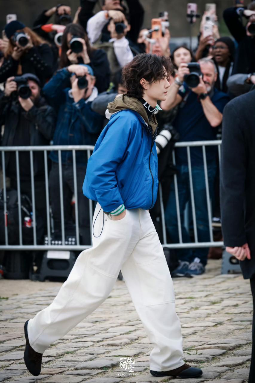 巴黎时装周,罗意威大秀,王一博巴黎三奢之行的第一站入场官摄,双手插兜的卷毛酷盖来啦! 时尚感和巨星气场浑然天成的王一博,是随便一截都是神图的存在。 王一博有多受瞩目?外国摄影师现场大喊“王一博”都喊破了音[捂脸]…… “阴天的巴黎,因王一博有了一抹优雅的蓝。” 王一博 王一博巴黎时装周