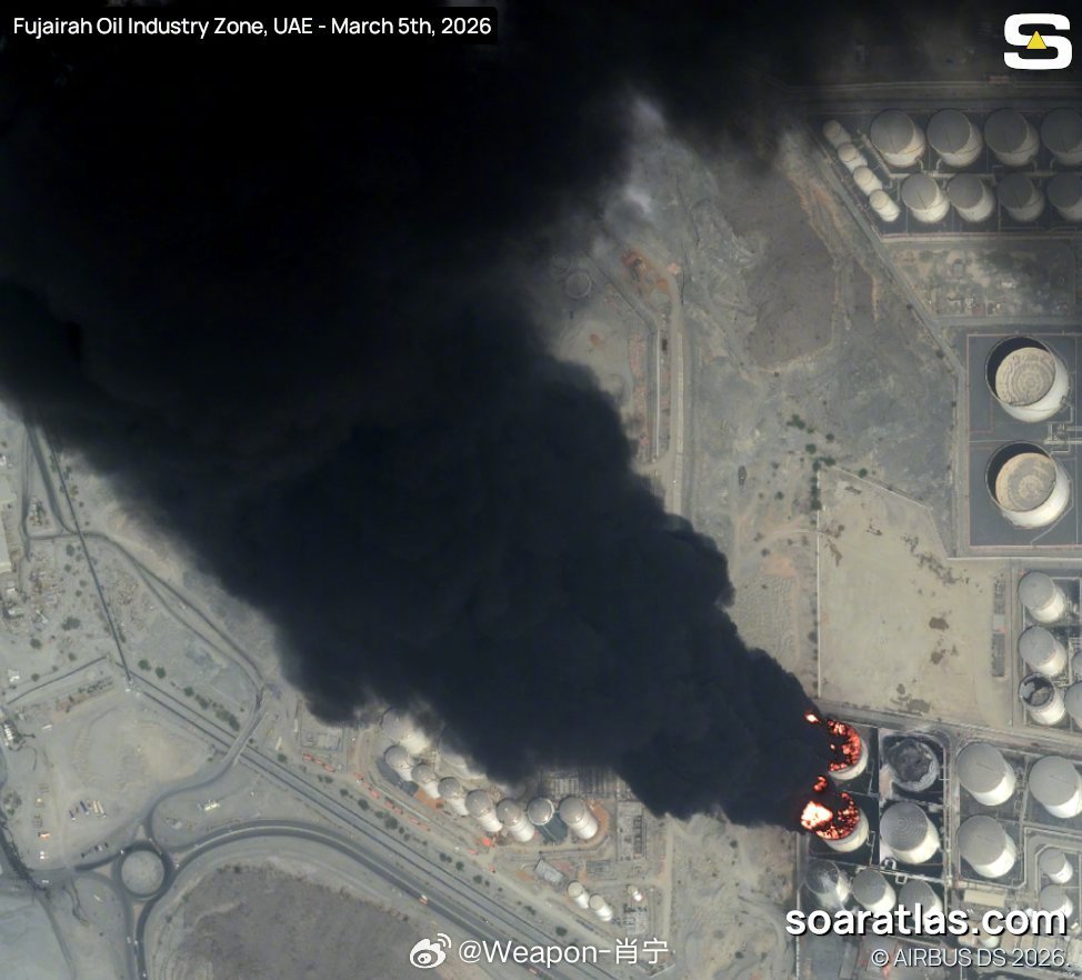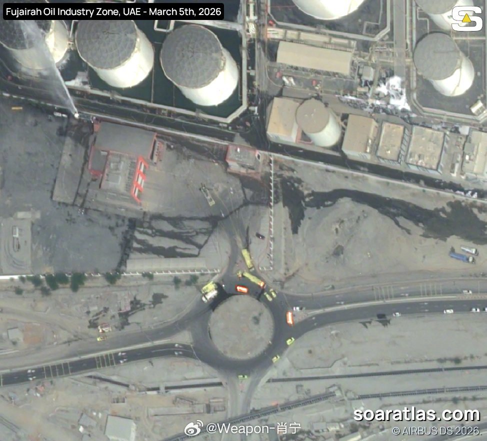 美以伊冲突 3 月 5 日阿联酋富查伊拉石油工业区最新的超高分辨率卫星图像。图像显示,两个储罐被火焰吞噬,工人们正喷水冷却其他储罐。其中一个储罐已被烧毁。
