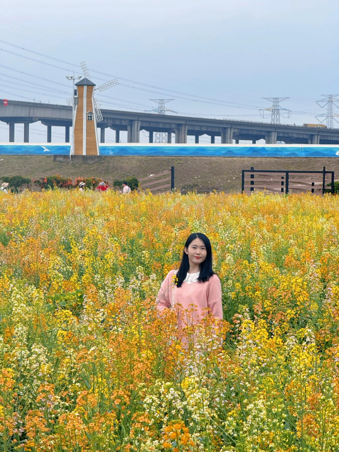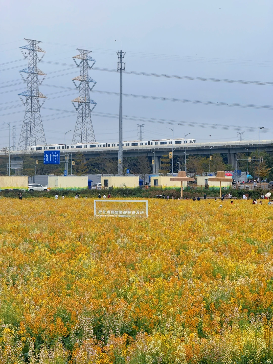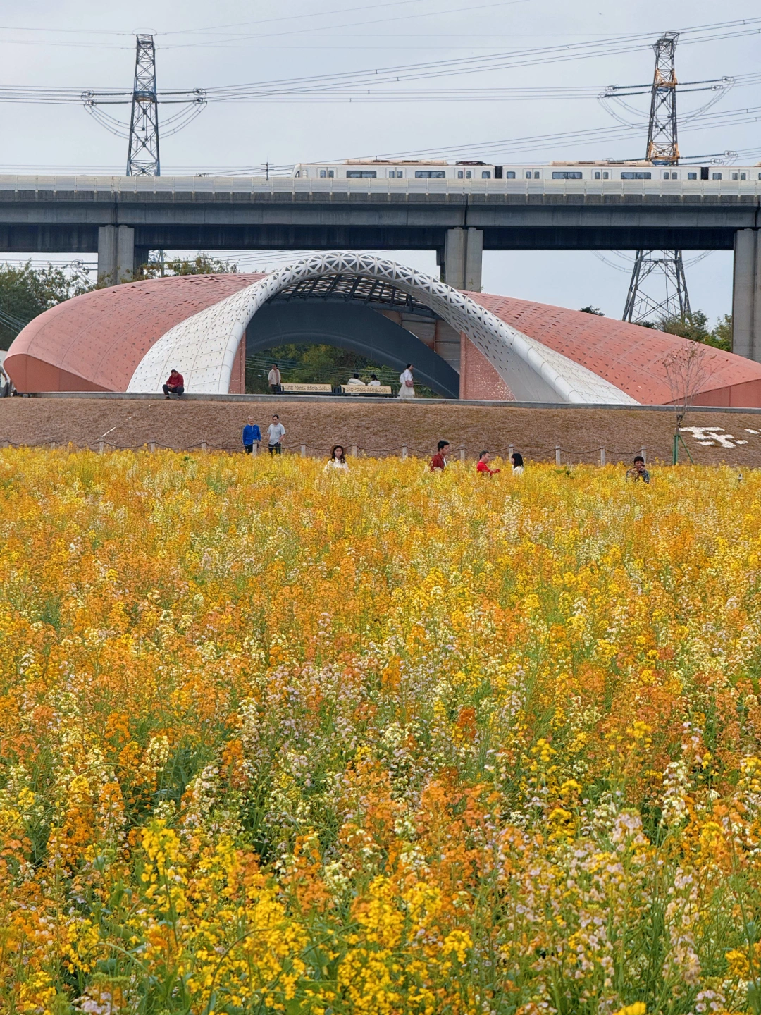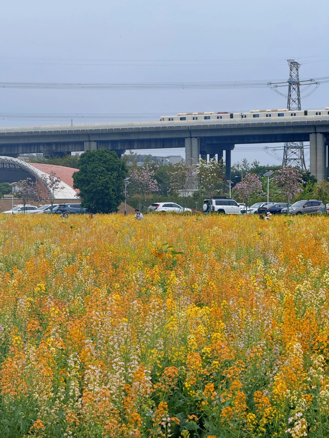 远处高架桥列车缓缓驶过🚅花海 + 列车 + 江景同框