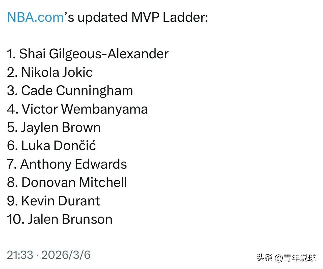 东契奇成笑话了! 今天晚上,NBA官方公布了最新一期的MVP排行榜,湖人队球星东契奇已经跌至第六位,接连被坎宁安、文班亚马、杰伦-布朗超越,要知道他曾一度排名榜单第二位,这眼看赛季进入了最后阶段,排名却越来越低,本赛季预计又要和MVP无缘了。值得一提的是,东契奇本赛季的场均得分为32.3分,高居联盟第一位;场均助攻8.6次,排名联盟第三位;拿下了如此夸张的数据排名却不升反降,要成为联盟的笑柄了!