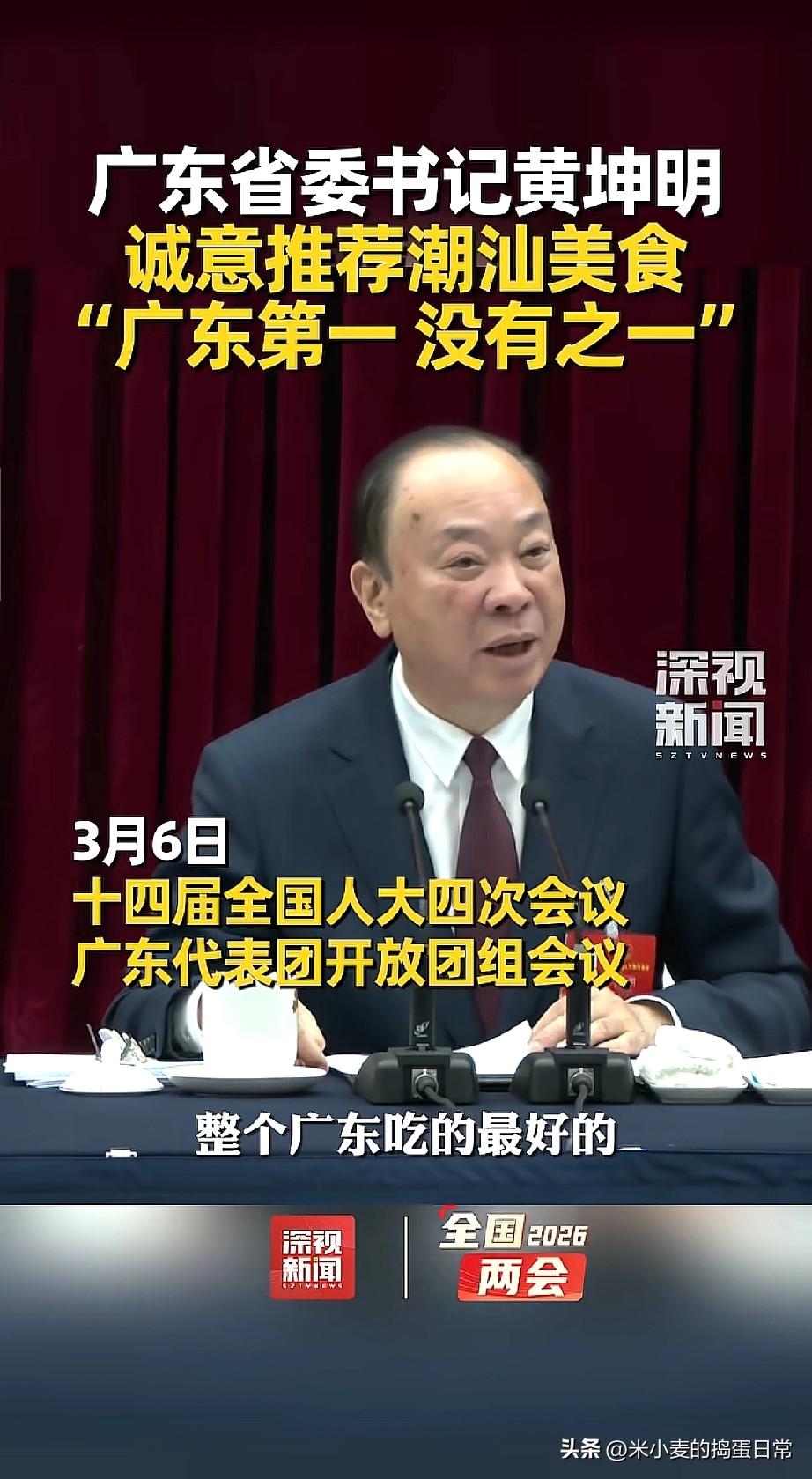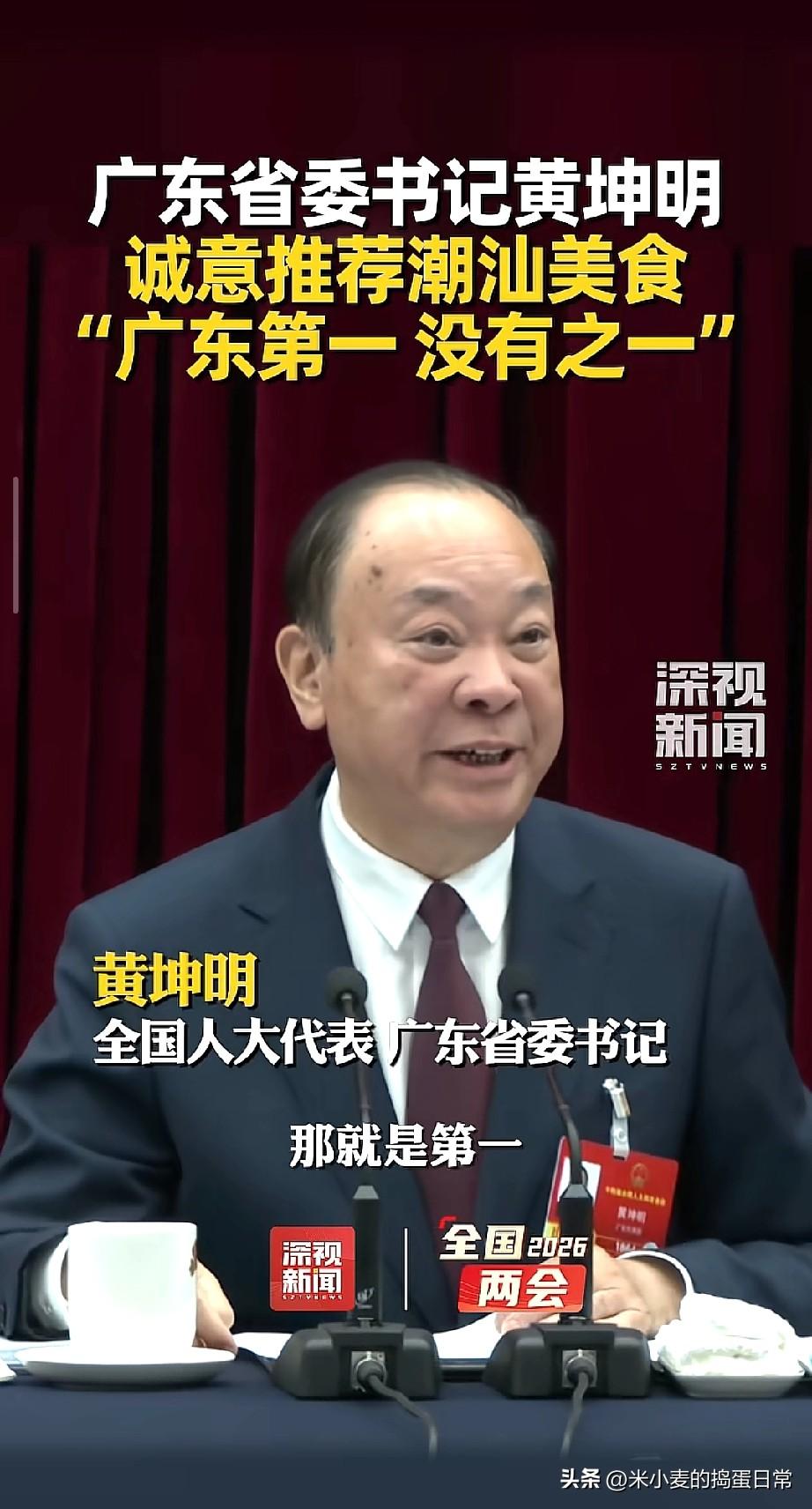 广东省书记夸赞潮汕美食广东第一 没有之一! 今天全国两会广东团开放日,省委书记黄坤明一句话直接引爆全场:“潮汕美食,整个广东吃得最好的,广东第一,没有之一!” 书记都亲自下场“带货”了,这分量谁顶得住啊! 作为潮汕人,我直接泪目了。从小吃到大的牛肉火锅、蚝烙、卤鹅、粿条,在书记嘴里成了“广东天花板”。 以前总有人争论顺德菜、广府菜谁是老大,现在书记一句话定调:潮汕美食,就是第一! 这不仅是对美食的肯定,更是对潮汕文化的认可。 书记都这么说了,今年必须再去潮汕吃个遍!