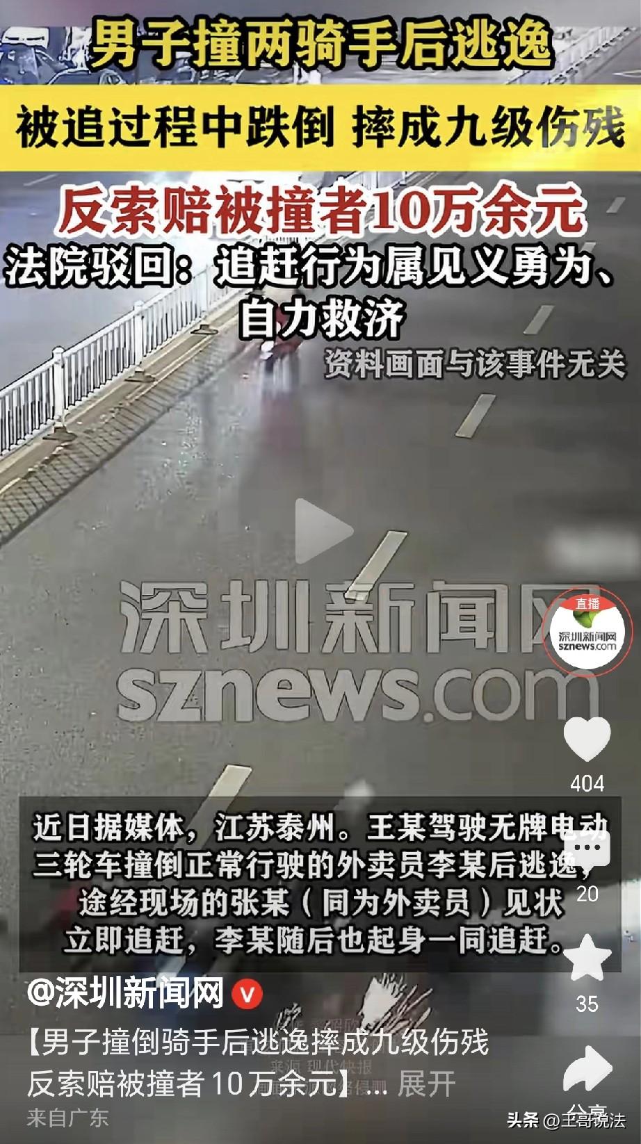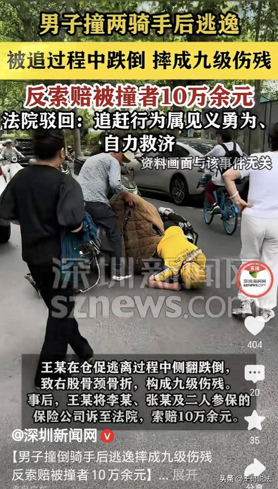 “自作孽,不可活!”江苏泰州,一男子开三轮车撞到外卖小哥,小哥受伤,男子跑了,另一外卖员路过,立刻骑车去追,被撞伤的外卖员也爬起来去追,男子怕被追上,他慌里慌张,从非机动车道左拐进机动车道,结果三轮车侧翻,男子被摔骨折,经交警认定,第一次事故男子撞人负全部责任,第二次事故男子侧翻,男子和2位小哥负同等责任,事后,男子越想越气,一纸诉状将俩外卖小哥和保险公司告到法院,索赔10万,法院的判决令人拍手称快! 2024年的一天,王某驾驶着一辆无牌电动三轮车,他不管不顾,一路往前突突的开着。 前面有一位外卖小哥,小哥骑着电动车正在派件,王某不知是走神还是操作不当,一头就撞到了外卖小哥身上。 只听“砰”的一声,小哥李某应声倒地,电动车飞了出去,李某受伤。 可王某没有停下,心想撞了就撞了,他开车就跑,连一句道歉都没有。 他心虚害怕,跑的飞快,刚好被另一位外卖小哥张某看到。 张某义愤填膺,你撞了人还想跑?真是缺德带冒烟的!他立刻骑车就去追赶王某。 他边追边大声呼喊,停下!你撞人了不能跑! 与此同时,受伤的小哥李某缓了过来,他不顾伤痛,起身也骑上了车辆,他加大了油门,呼呼的赶上。 王某越跑越怕,听到外卖小哥的呼喊他更急了,他慌里慌张,一心只想快点摆脱。 他一时之间,慌不择路,从非机动车道仓促地左拐,瞬间开进了机动车道。 可由于他车速过快,加上转弯太急,王某的三轮车突然失去了平衡,他把持不住,“哐当”一声就侧翻在地。 他随着车辆,重重摔了出去,顿时摔得不能动了。 他大呼小叫,疼的在地上翻滚,交警赶到了,立刻将他送去抢救。 经过诊断,王某右股骨颈骨折,被鉴定为九级伤残,这回他不急了,老老实实在医院躺着。 交警经过调查,这才发现这是一起连环事故,如果王某肇事后及时停下,那就不会有后面的事故。 因此交警认定,第一次撞人事故,王某负全部责任;第二次侧翻事故,王某、李某、张某三方负有同等的责任。 本以为事情就这么过去,可王某躺在病床,越想越气,他暗自琢磨,看能不能再弄点钱出来。 他仔细一想,要不是李某王某对自己紧追不舍,自己也不会摔成这样。 他可是丝毫没想,如果不是他撞人逃逸,哪里会有后面的事情! 他想来想去,不肯罢休,他写了张诉状,将李某、张某以及二人参保的两家保险公司告到了法院,索赔10万余元,还让保险公司在保险责任范围内承担责任。 有人认为,不是谁受伤谁有理,肇事逃逸本就是违法行为,过程中无论伤残如何都是自己全责! 更有人说,本身驾驶无牌无照的机动车撞人又逃逸,是所有事件的罪魁祸首,所以就该他自担责任! 话说的不错!法院经过审理,认为王某撞人后逃逸,其行为本身就违法且不道德。 《民法典》第1165条第1款规定:行为人因过错侵害他人权益造成损害的,应当承担侵权责任。 李某和张某的追赶行为是为了维护自身合法权益、制止违法行为,属于正当行为。 而王某受伤是自身肇事逃逸、违规变道导致,李某、张某的追赶属于合理维权和见义勇为,并无过错。 因此法院认为,王某属于自陷风险,应自负其责,法院驳回了王某的诉讼。 王某为自己的错误行为付出了代价,真是应了那句自作孽,不可活! 对此,你怎么看?