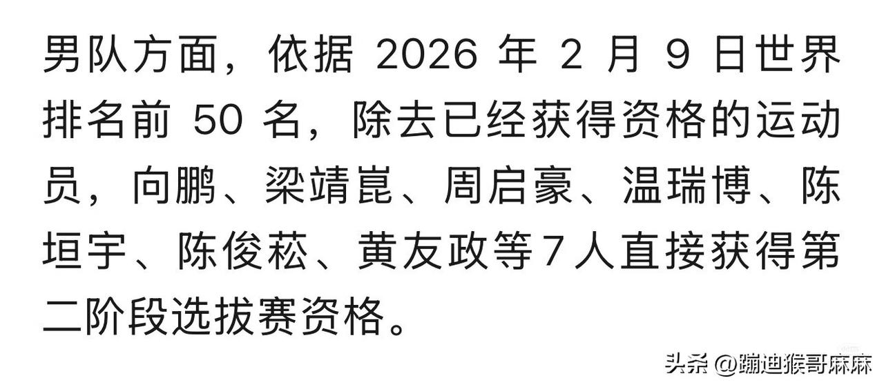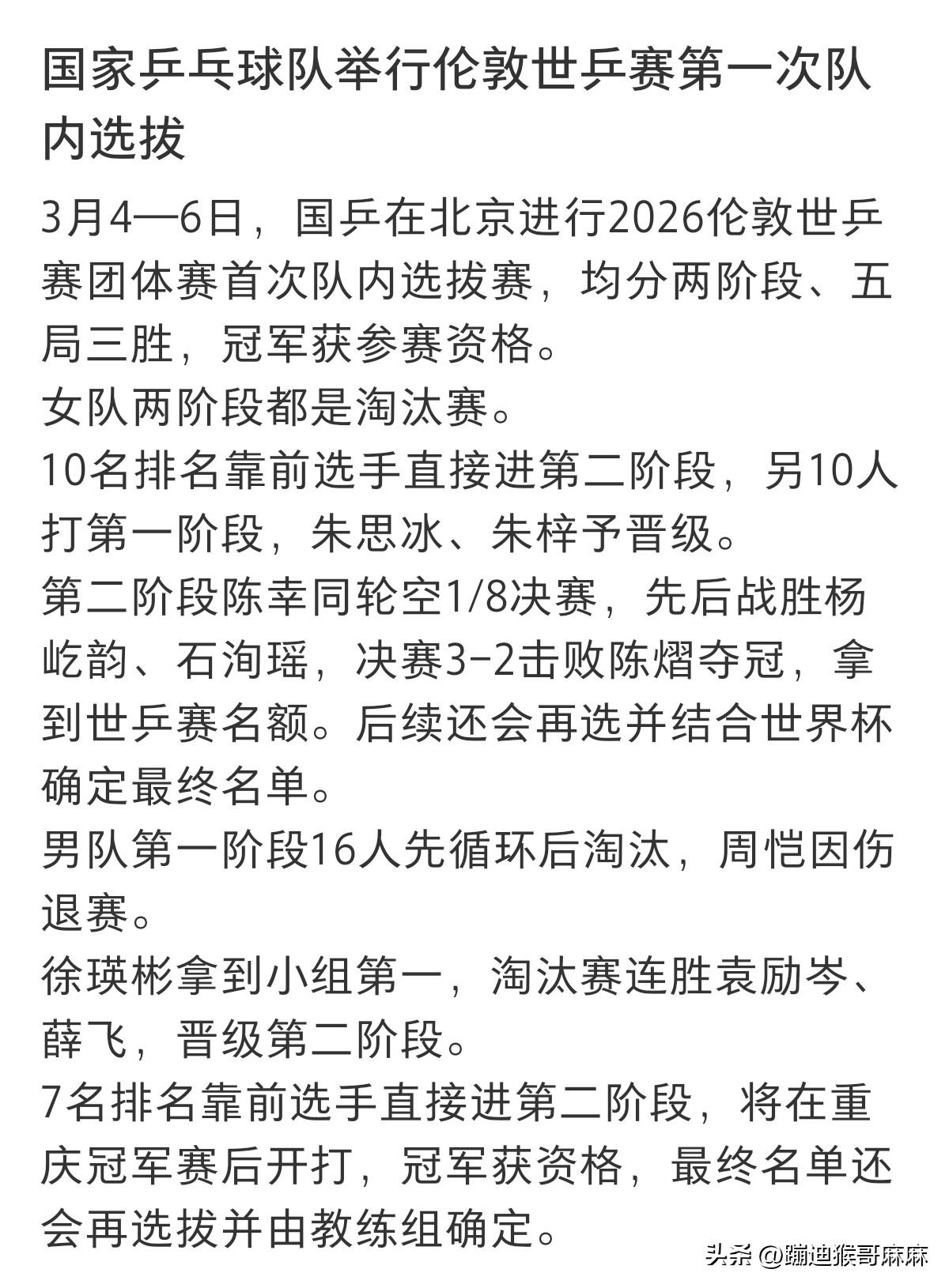 这个选拔赛的结果惊不惊喜,意不意外?!女队陈幸同获得伦敦团体赛参赛资格,没有意外,男队徐瑛彬又过五关斩六将,晋级第二阶段,这内战胜率还真是居高不下! 2026年伦敦世乒赛团体赛第一次队内选拔赛于3月4日至6日在北京举行,全程采用五局三胜制。女队决出一个直通名额,男队完成第一阶段并确定第二阶段参赛阵容。 女队赛制与结果 - 两阶段均为淘汰赛。依据2026年2月9日世界排名,陈幸同、蒯曼、王艺迪、陈熠等10人直接进入第二阶段。 - 第一阶段由排名50名后及无排名的在京运动员参赛,朱思冰、朱梓予获前两名晋级第二阶段。 - 第二阶段决赛:陈幸同3-2战胜陈熠,获得伦敦世乒赛团体赛参赛资格。 男队赛制与结果 - 第一阶段:16人(周恺因伤弃权)采用先循环后淘汰赛制。薛飞、徐瑛彬、袁励岑、孙杨获小组第一进入淘汰赛;最终徐瑛彬3-2击败薛飞,晋级第二阶段。 - 第二阶段:向鹏、梁靖昆、周启豪、温瑞博、陈垣宇、陈俊菘、黄友政7人凭排名直接入围,将与徐瑛彬共8人争夺1个直通名额。 - 第二阶段比赛将于WTT重庆冠军赛后进行。 已提前锁定资格的选手 王楚钦、孙颖莎(2025多哈世乒赛单打冠军),樊振东、王曼昱(全运会单打冠军),以及依据2月9日排名入围的林诗栋等已提前获得资格,不参与本次选拔。 女队选拔也是挺有意思,新加坡大满贯陈幸同刚0-4输给陈熠,这次选拔赛又3-2赢了陈熠,获得参赛资格,短短几天,赛果大反转,果然乒乓球没有应该…… 女队还有两个名额,男队还有2-3个名额,最后花落谁家,估计还得等澳门世界杯后了! (图片素材来源于乒乓世界和网络)