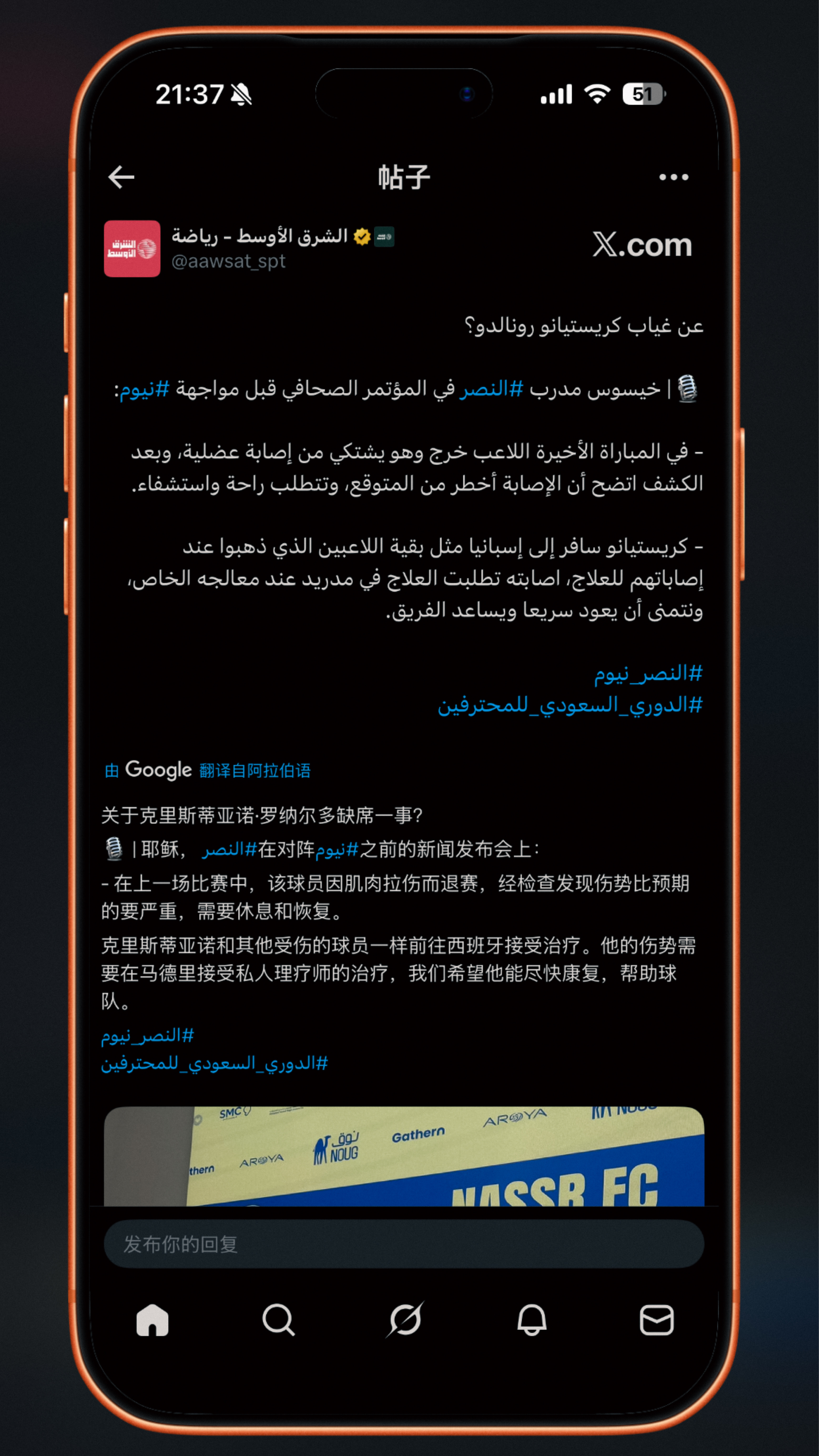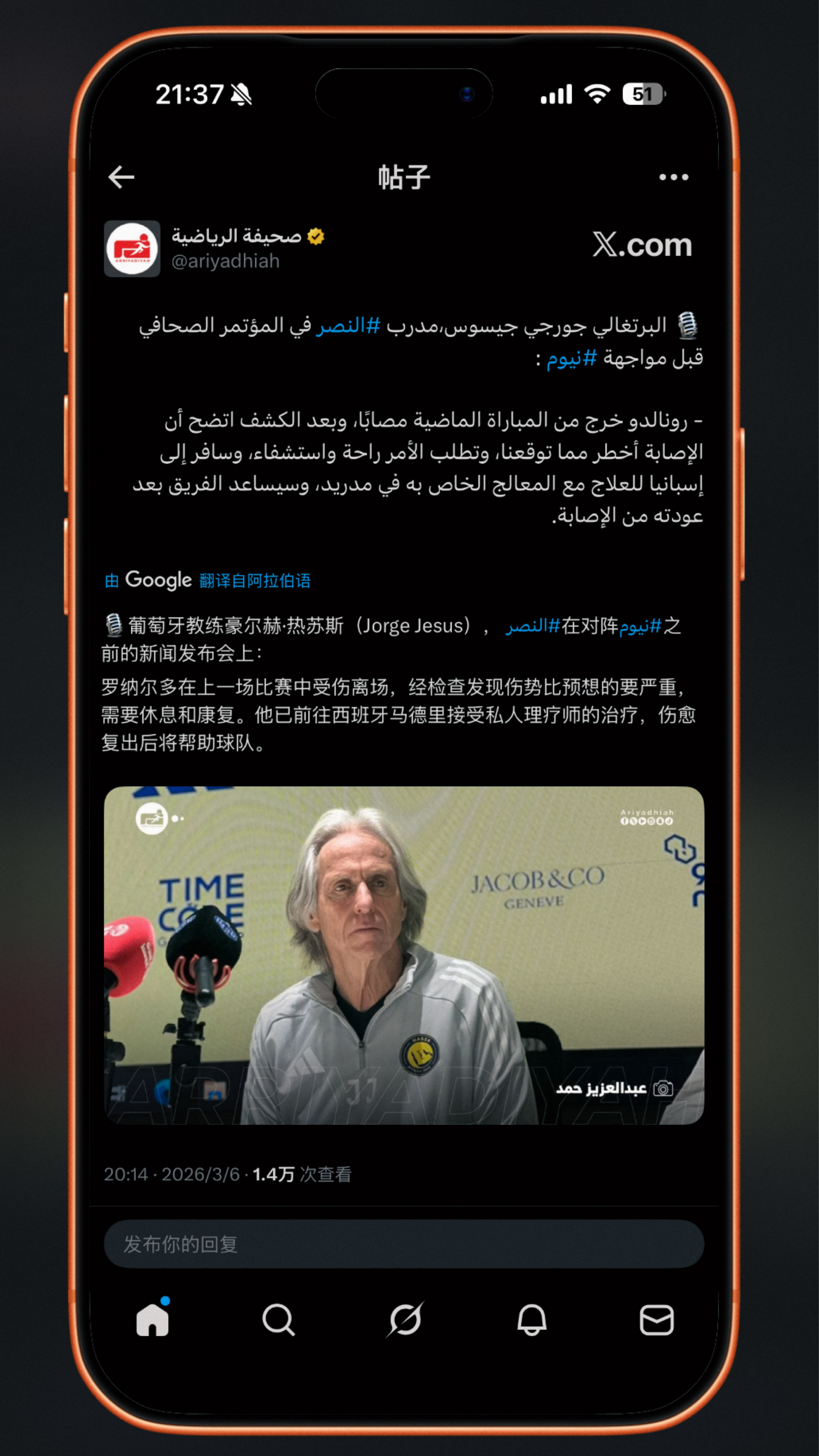 🌟 在对阵未来城体育的赛前新闻发布会上,热苏斯表示:“罗纳尔多已经前往西班牙马德里,在他的私人理疗师的指导下接受治疗,这与之前艾曼·叶海亚和萨米·纳贾伊的情况类似。他将在完成治疗后回归球队,但罗纳尔多将缺席接下来对阵尼奥姆和阿尔哈利吉的比赛。”