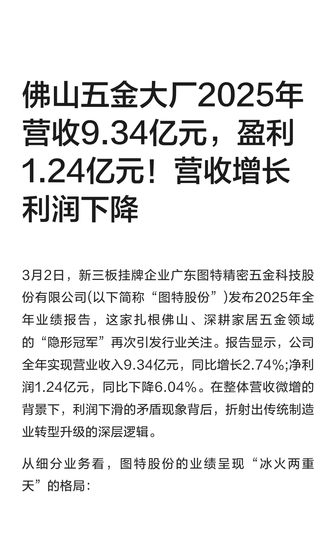 佛山五金大厂2025年营收9.34亿,盈利1.24亿