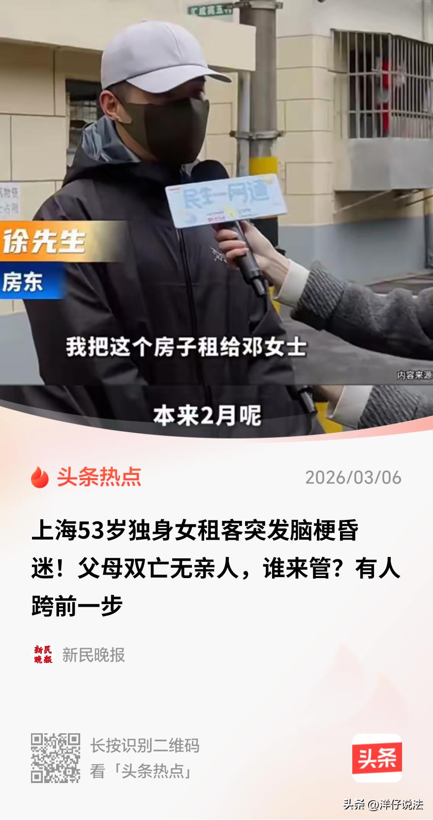 上海,房东催了几天房租,53岁女租客一直失联,他上门敲门,屋里明明有响动,就是没人开。房东心里发毛,报了警。等警方破开门,却发现女租客直挺挺躺在地板上。120把人拉走,医院说是急性脑梗死,早错过最佳抢救时间了。更让人抓瞎的是,女租客的父母早没了,没结过婚,也没子女,连个签手术同意书的人都找不着。人就这么躺在医院,昏迷不醒。两个居委会来回踢皮球:一个说“人住你那儿的你管”,一个说“户籍在我这儿可人不在”。她名下明明有拆迁款,可没人签字取不出来,钱在银行,人躺医院,谁也动不了。 据悉,房东老徐有套房子,租给了一位53岁的邓女士。 邓女士这人吧,平时挺安静的,一个人住,房租一直交得也爽快。 但到了2月份,该交房租的日子都过了好几天,老徐的账户上还是静悄悄的。 老徐心里就犯嘀咕了,这邓女士看着不像赖账的人啊,他先打了几个电话,通了,但没人接。过会儿再打,还是没人接。 连着几天,电话打了不下十来个,愣是石沉大海。老徐这心里头,那不祥的预感就跟水草似的,越长越密。 2月12号那天,老徐坐不住了,决定亲自上门看看。 到了门口,他先敲门,咚咚咚,没反应。侧着耳朵仔细听,屋里头好像有点动静,窸窸窣窣的,但就是没人来开门,也没人应声。那种感觉,说不出的诡异。 老徐心里咯噔一下,汗毛都快竖起来了,不敢再等,当即拿出手机报了警。 警方来得很快,120救护车也跟着来了。 门是专业人员破开的,等门一推开,等大家看清屋里的情形,在场所有人都倒吸了一口凉气。 邓女士,就直挺挺地躺在冰冷的地板上,一动不动,人已经完全没有意识了。 谁也不知道,她到底在这儿躺了多久。 医生赶紧上前检查,初步判断情况很严重。 老徐当时也顾不上别的了,和其他人,七手八脚地把邓女士抬上救护车送到了医院。 医院的诊断结果为急性脑梗死。 医生把老徐和居委会的人叫到一边,脸色凝重地摇了摇头:“送来晚了,已经错过了最佳治疗时间。” 医院这边要救人,得做手术,得定治疗方案,这些都需要家属签字。 这时候大家才发现,邓女士父母早就没了,没结过婚,更没有子女,七大姑八大姨之类的亲戚,翻遍了通讯录,一个都找不着。 这可怎么办?手术没人签字,治疗方案没人拍板,人就这么躺在急诊留观室的病床上,昏迷不醒,一天,两天,一个多礼拜过去了,就这么干耗着。 没人照料,更没人能给她接下来的治疗做主。 房东老徐是彻底懵了,他就是个收租的,哪遇到过这种事? 他找到房子所在地的居委会,居委会的干部也犯难,搓着手说:“按政策,这事儿该归她户籍地的居委会管,我们管不了啊。” 老徐又赶紧联系邓女士户籍地的居委会,那边一听,头也摇得像拨浪鼓:“她人是在你那儿出的事,房子也租在你那儿,长期不在我们辖区居住,这监护责任,按理说该由居住地的居委会来承担。” 就这样,谁也不敢轻易接下这个烫手的山芋。 就在所有人都觉得走投无路的时候,徐汇区华泾镇站了出来,他们表了态:这事儿,我们往前迈一步,不能眼看着人没了不管。 3月3号上午,华泾镇社区服务办的王主任介绍了邓女士的最新情况,他说,邓女士目前的病情依然非常危重,医院那边只能做一些维持性的治疗。 接下来怎么办?王主任也说了,如果实在找不到任何亲属,华泾镇会按照法律规定,先给邓女士启动一个民事行为能力的司法鉴定。 鉴定完了,再通过法律程序,正式指定她户籍所在地的居委会来担任她的监护人。 这样,后续所有的事情,就都能有人出面去办了。 有人说,这确实很难,居委也是没办法。签字意味着啥?意味着担责任。万一钱花了人没救回来,后面蹦出个八竿子打不着的亲戚来闹,这责任谁担? 《民法典》第二十八条规定,成年人倒下后,配偶、父母、子女、其他近亲属依次有监护权。 本案中,邓女士父母没了、没结婚、没子女,这条道堵死了。 那谁管? 《民法典》第三十二条规定,没有依法具有监护资格的人的,监护人由民政部门担任,也可以由具备条件的居委会担任。 《民法典》第二十五条规定,经常居所与户籍地不一致的,经常居所视为住所。 鉴于邓女士长期租住在华泾镇,这地方在法律上就是她的住所地。说白了,属地责任跑不掉,当地居委会理论上可以成为监护人。 不过,监护人怎么来?得走法律程序:先申请法院认定邓女士为无民事行为能力人,再指定居委会当监护人。 但这套流程走完,监护人拿着法院判决书去银行,钱才能取出来救急。 此外,《民法典》第三十一条第三款规定,在指定监护人前,被监护人处于无人保护状态的,由住所地的居委会、民政部门担任临时监护人。 这就意味着,当地居委完全可以先以临时监护人身份协调医院救治、垫付费用,事后再从邓女士财产中扣还。 对此,您怎么看?