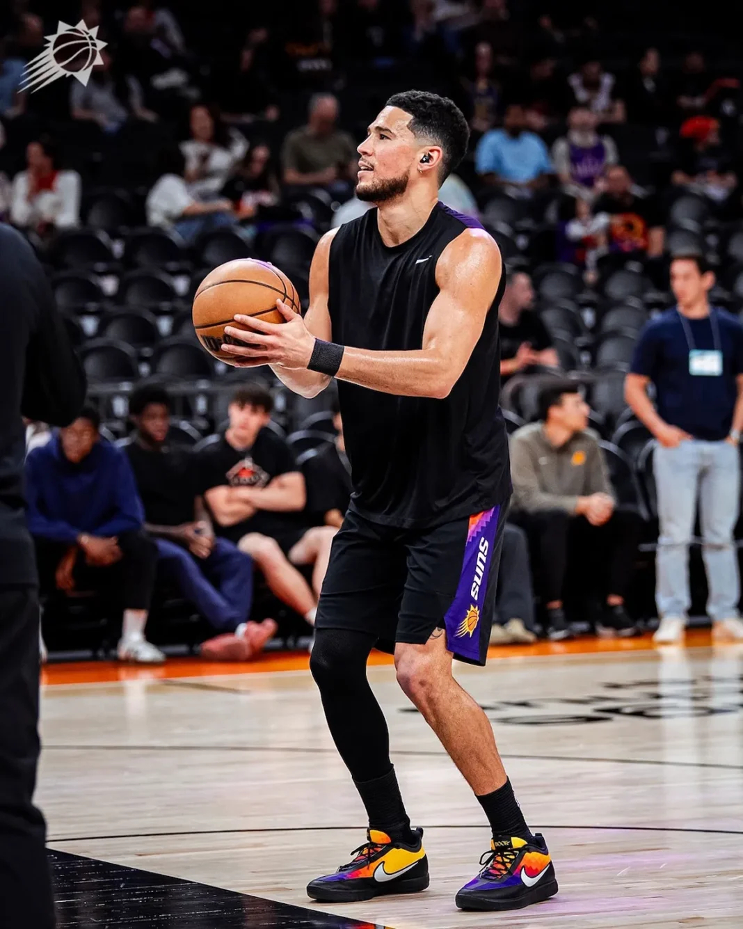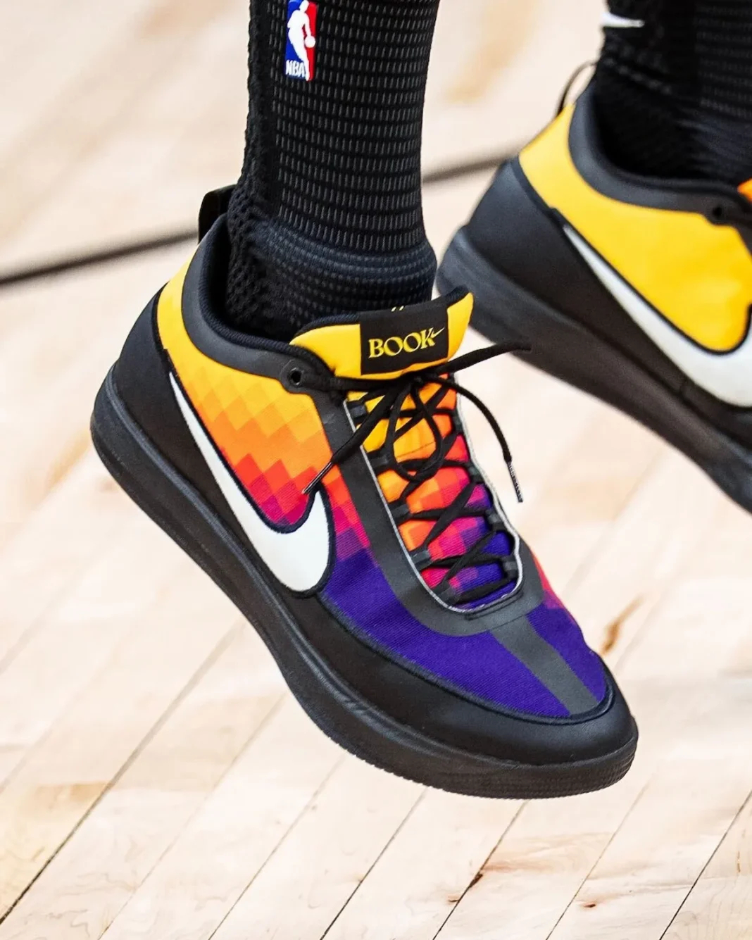 布克在上脚 Nike Book 2 “The Valley” 配色战靴,该配色的设计灵感源于太阳队2025-26赛季城市版球衣。