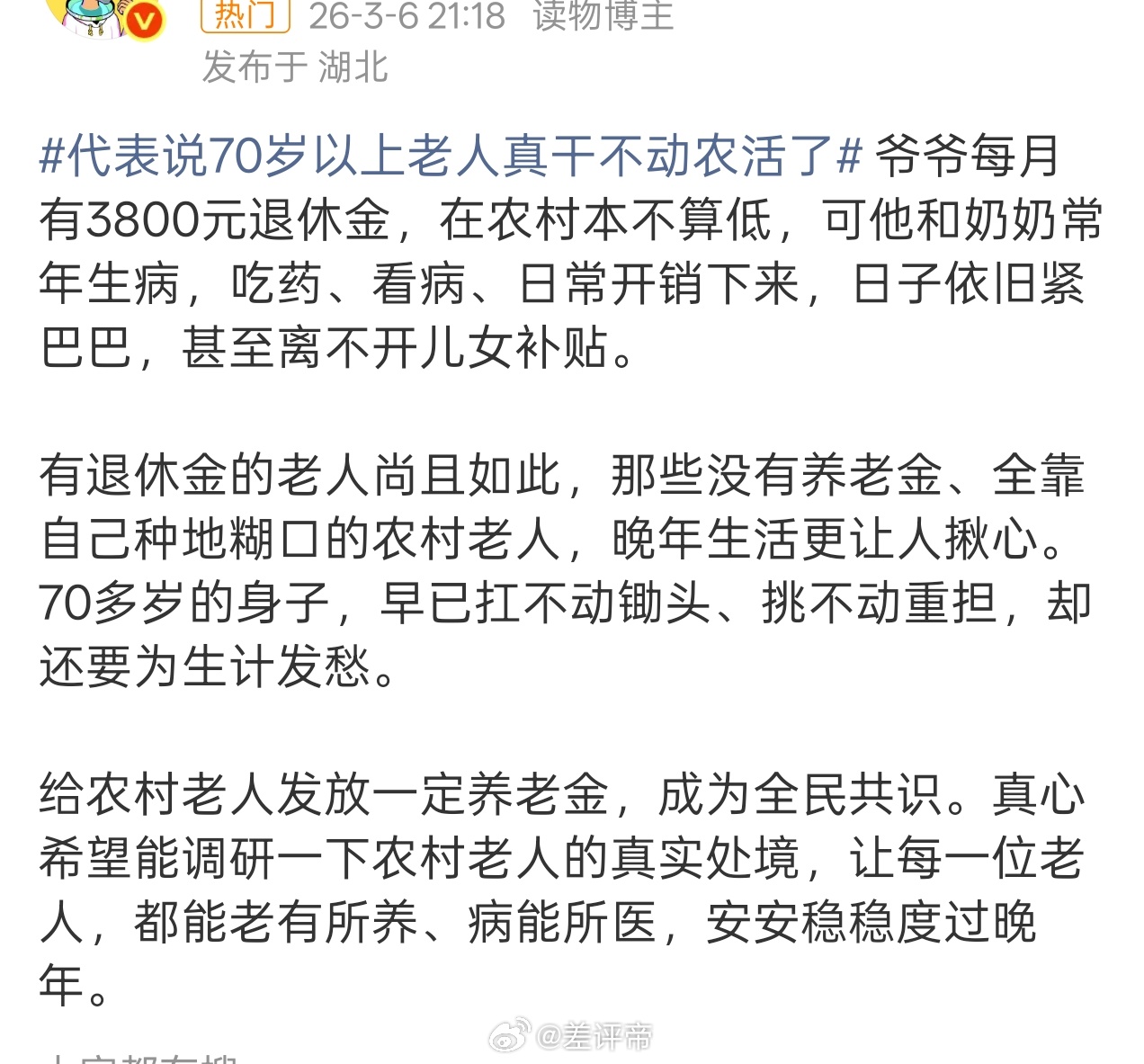 代表说70岁以上老人真干不动农活了这个每个月有3800的退休金+儿女补贴的老人吃药、看病,日常开销日子都紧紧巴巴的。。那,那些连退休金都没有的。。。。