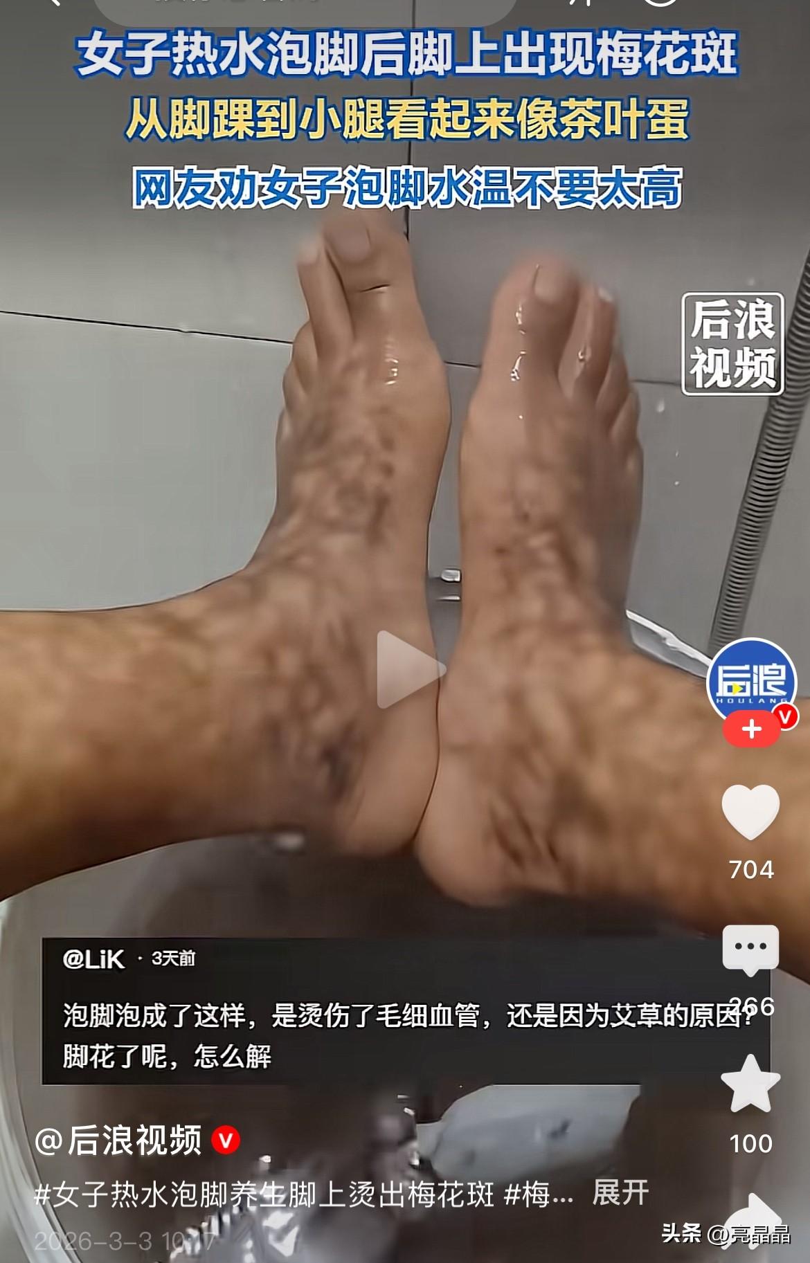 万万没想到!广西,一女子用热水泡脚养生,泡完脚上却显出梅花斑,看起来就像茶叶蛋,吓得女子网上求助。 天冷了,女子就把艾草包泡到热水里,拿来泡脚,艾草可以起到温通经络、散寒除湿的作用,女子觉得用它泡脚肯定能让自己浑身暖乎乎,还能养生。 她舒舒服服地泡了大概半小时,可当她把脚从水里拿出来,瞬间就傻眼了。 只见两只脚上从脚踝到小腿,密密麻麻布满了梅花形状的斑点,像网格状条纹,真就跟茶叶蛋上的花纹似的。 女子心里“咯噔”一下,这好好泡脚怎么还泡出问题来了,赶紧网上求助万能网友。 “泡脚泡成这样,是烫伤了毛细血管,还是因为是艾草的原因?脚花了呢?怎么解?” 网友们纷纷出谋划策。有网友说,这是低温烫伤,就是泡脚的水温太高了,烫伤了血管。 有网友说,这是把血管里的血液烫熟了,类似血豆腐的道理,泡脚不能用太烫的水,不然不但不能起到养生效果,还会烫伤。 还有网友说,我之前也有过这样的经历,梅花斑点大概一年多才消失,怕的我都不敢穿凉鞋。 也有网友举例,不仅仅泡脚热水太烫会出现斑点,冬天烤火的时候,小腿也会出现网格状条纹。 女子想泡脚养生,却弄巧成拙。养生之道不能大意,不能盲目跟风,泡脚不能追求越烫越好,适合的水温才能求到温通经络的功效。 养生要讲究科学方法,要选择合适自己体质的方式和方法,循序渐进地养护身体,才能起到强身健体的效果。 养生前咨询医生,科学、理性养生才是硬道理! 你有什么好的养生之道呢?欢迎评论区讨论。