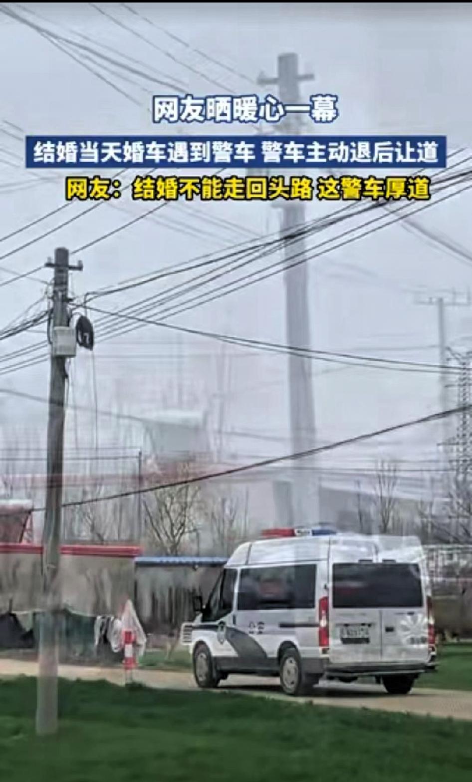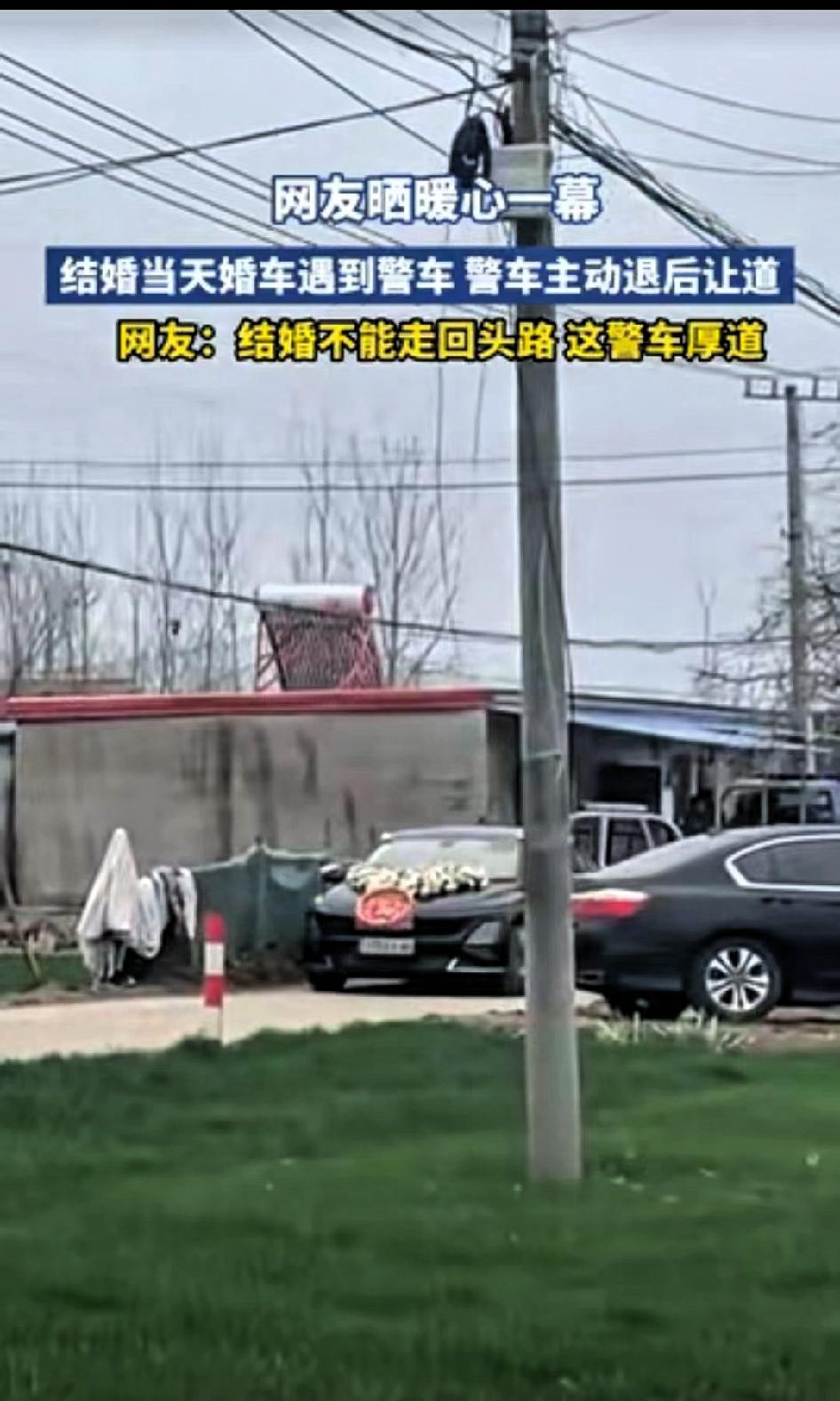 格局打开了,江苏,一对新人结婚,婚车驶出村庄时,恰巧遇到一警车。 警车主动倒车避